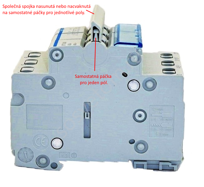 Podle obrázku níže jsou tam tři menší samostatné páčky pro jednotlivé póly a ta společná páčka je na ně nasunutá nebo nacvaknutá. Pokud by se ta společná páčka sundala tak by měly zůstat jen ty tři samostatné menší páčky. Případně by se dala ta společná páčka po sundání říznout na tři samotné kusy a ty pak po rozříznutí nacvaknout zpět na ty menší samostatné páčky pólů.