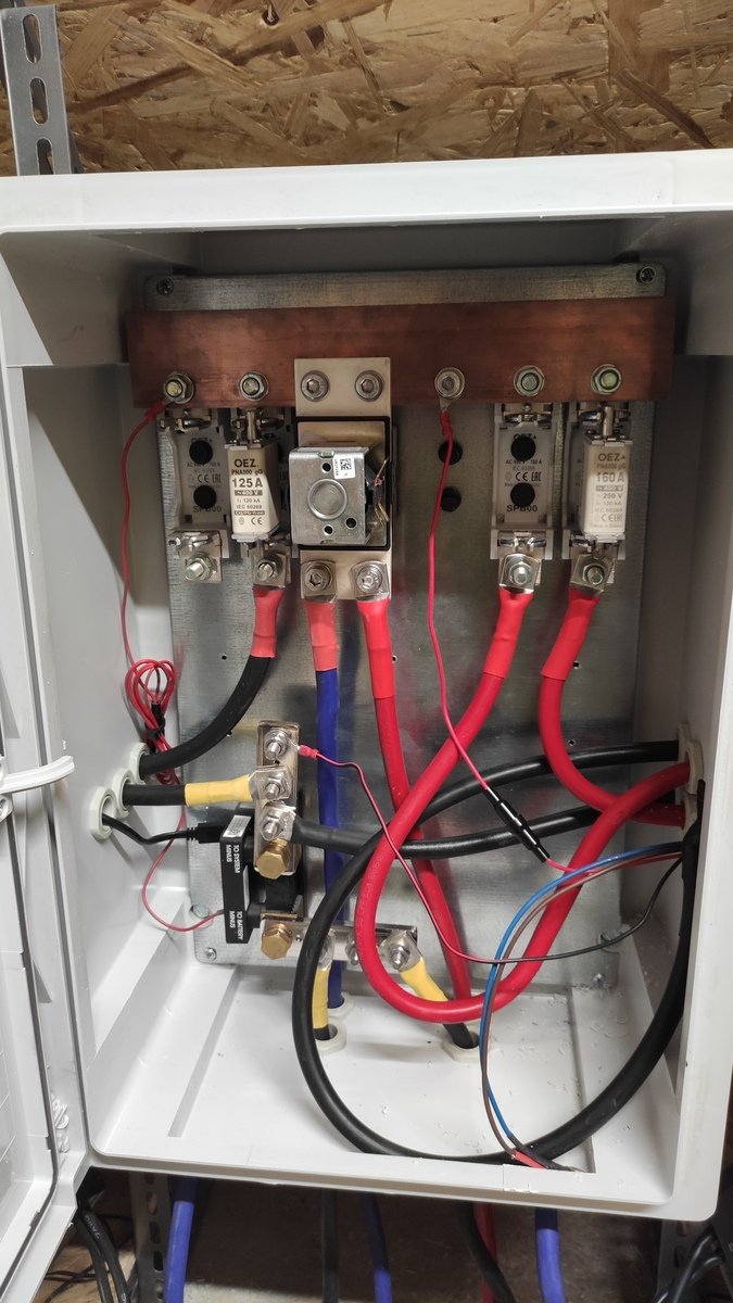 Skrinka 350x500x190, plus busbar 50x10, mínus 30x8. V strede je DC kontaktor, ktorý chcem využiť na Total stop.