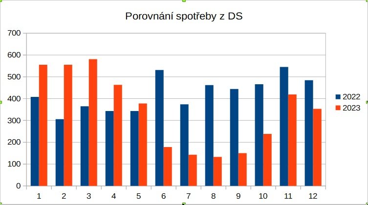Graf spotřeby EE z DS. Data jsou bohužel ne úplně přesná. Ne vždy byl udělán odečet přesně na konci nebo začátku měsíce. Navíc v polovině roku došlo k navýšení spotřeby EE v důsledku dokoupení dalších el. spotřebičů (druhá kombi chladnička, myčka atd.), což trochu graf zkresluje.