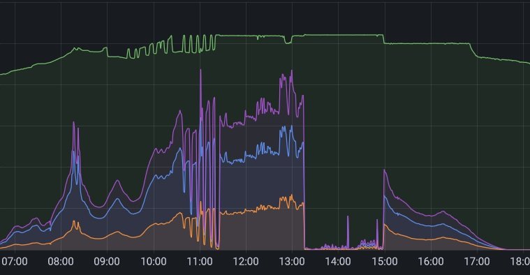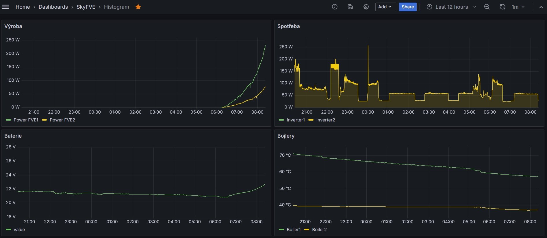 Navýšení výkonu na 4,3kWp je sakra poznat. Včera do cca 13:30 byl upečený oběd, byla nabitá baterie (což ale není zas takové uměni při její kapacitě) a ohřáta voda na 80st. Když jsem si odpoledne všiml, že se FVE už fláká, tak jsem ještě pustil zbytek energie do akumulaček