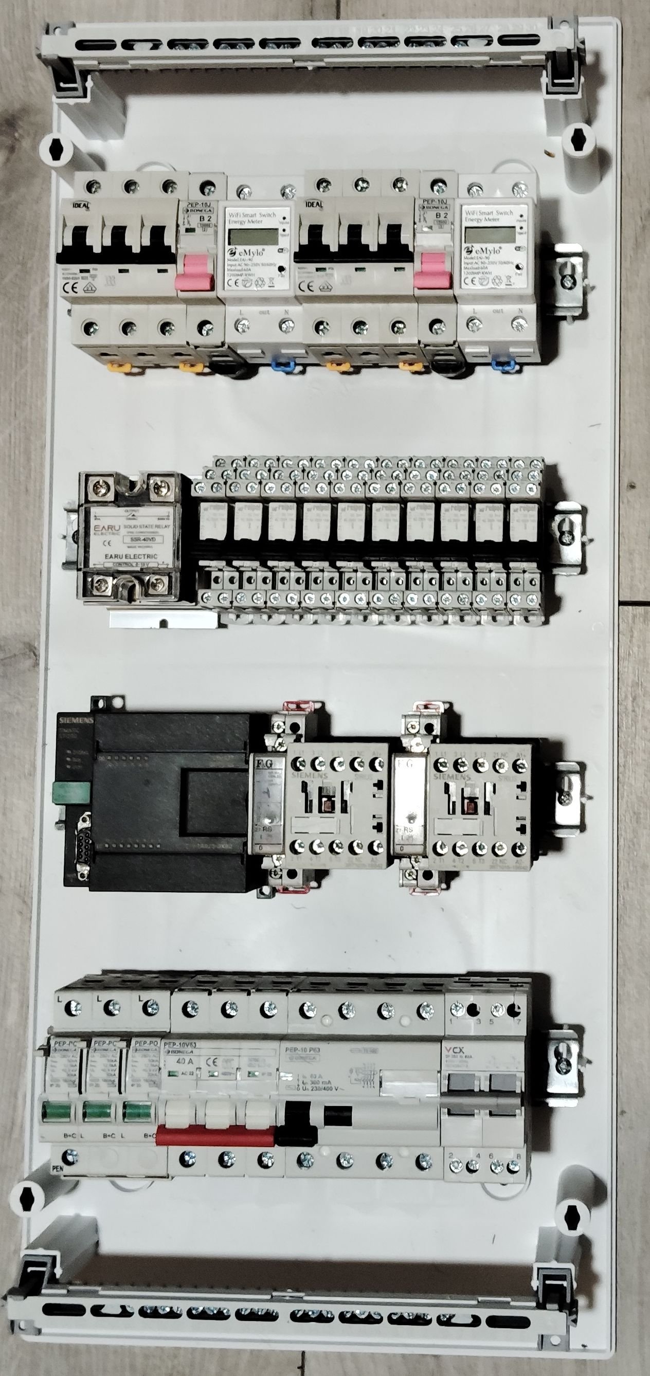 2. řada - budoucí 5ti kanálový vytěžovač: jistič DC části, převodník PWM/0-10V (pro SSR), PLC Siemens S7-200