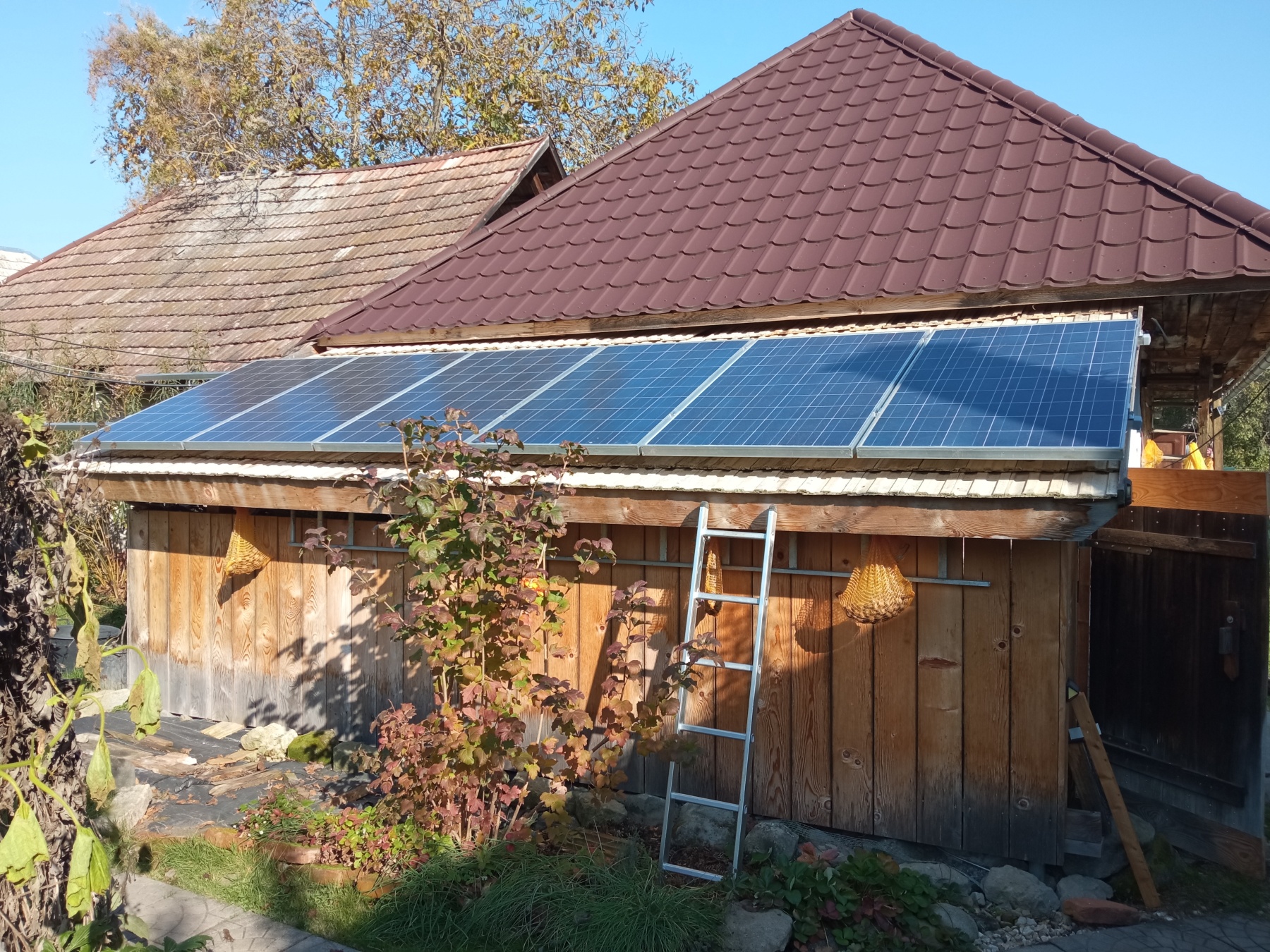 V prístrešku mám 8 ks starších panelov 240 Wp, ktoré pôjdu na tento prístrešok, orientácia ZJZ, sklon asi 30°, budú pár metrov od strojovne. Neskôr by mali pribudnúť 3 ks 450 Wp na JJV so zimným sklonom a k nim paralelne ďalšia trojica na ZJZ. Ako neskôr, to uvidím, kúpili sme dom