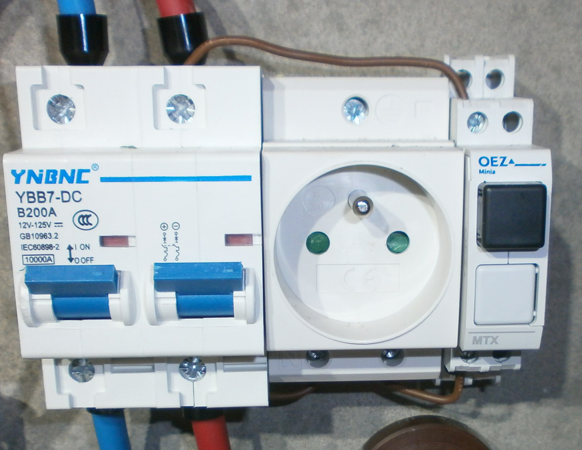 V prvých dňoch, kým nemám vo všetkých režimoch odsledované správanie sa regulátora aj akumulátora a zapojené vyrážacie cievky DC ističov vedenia do panelov, každý večer FVE vypínam, minimálne napájanie regulátorov z panelov. Občas pre nejaké drobnosti odpojím aj menič či regulátor od zbernice akumulátora. Aby som pri pripájaní nevystavoval tieto prístroje tvrdým prúdovým nárazom z tvrdého akumulátora, pripojenie riešim cez "žiarovkový štartér pripojenia". Videl som rôzne spôsoby, ako to robiť so žiarovkou, ja som si vymyslel "automatiku". Tvorí ju DIN lišta so zostavou dvoch poistiek OEZ OPVP22 125A, DIN zásuvka a spínacie tlačítko OEZ. Pri odpojených poistkách zapnem poistku "minus", zapojím žiarovku 100, 150 alebo halogen 500 W, stlačím tlačítko a po piatich sekundách zapojím aj poistku "plus" a pustím tlačítko. Občas pri tom meriam napätie na vstupe do regulátora, už sú na ceste veci na úplnú automatizáciu vrátane merania napätia