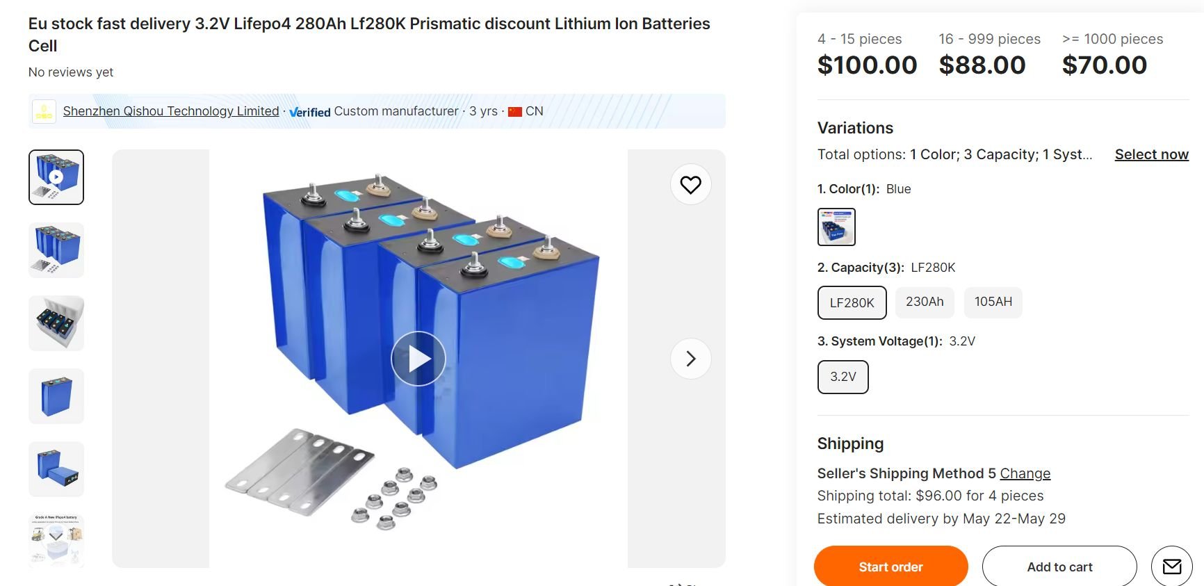 Doporucuji se podivat i na nkon.nl evropsky preprodej, se zarukou, 280Ah od 70eur, kupujem tam clanky 18650 a 21700, tisice ks, vzdy vse bez problemu.