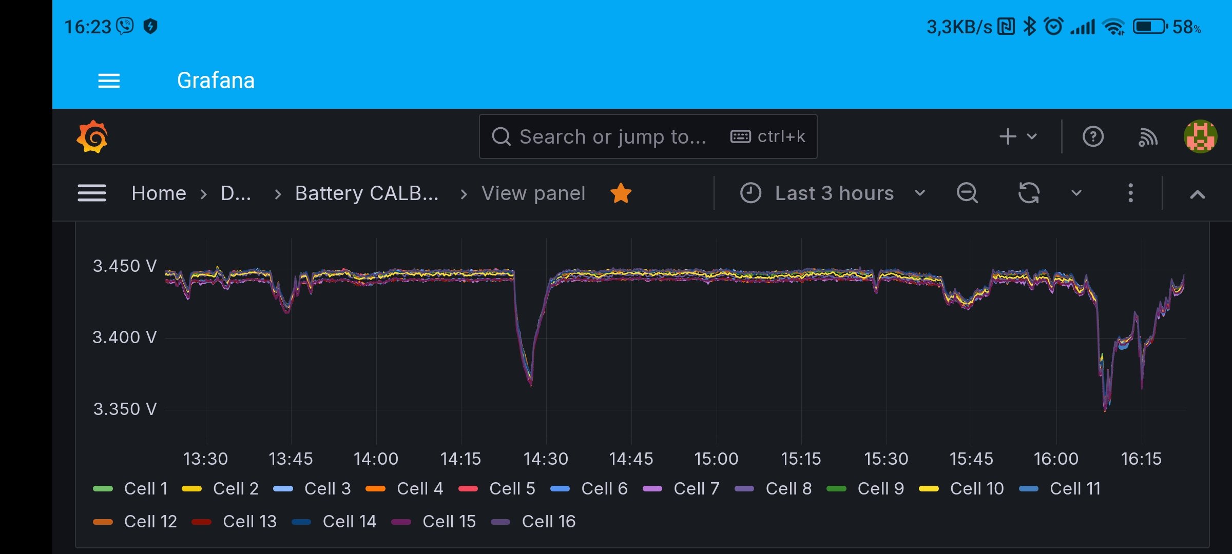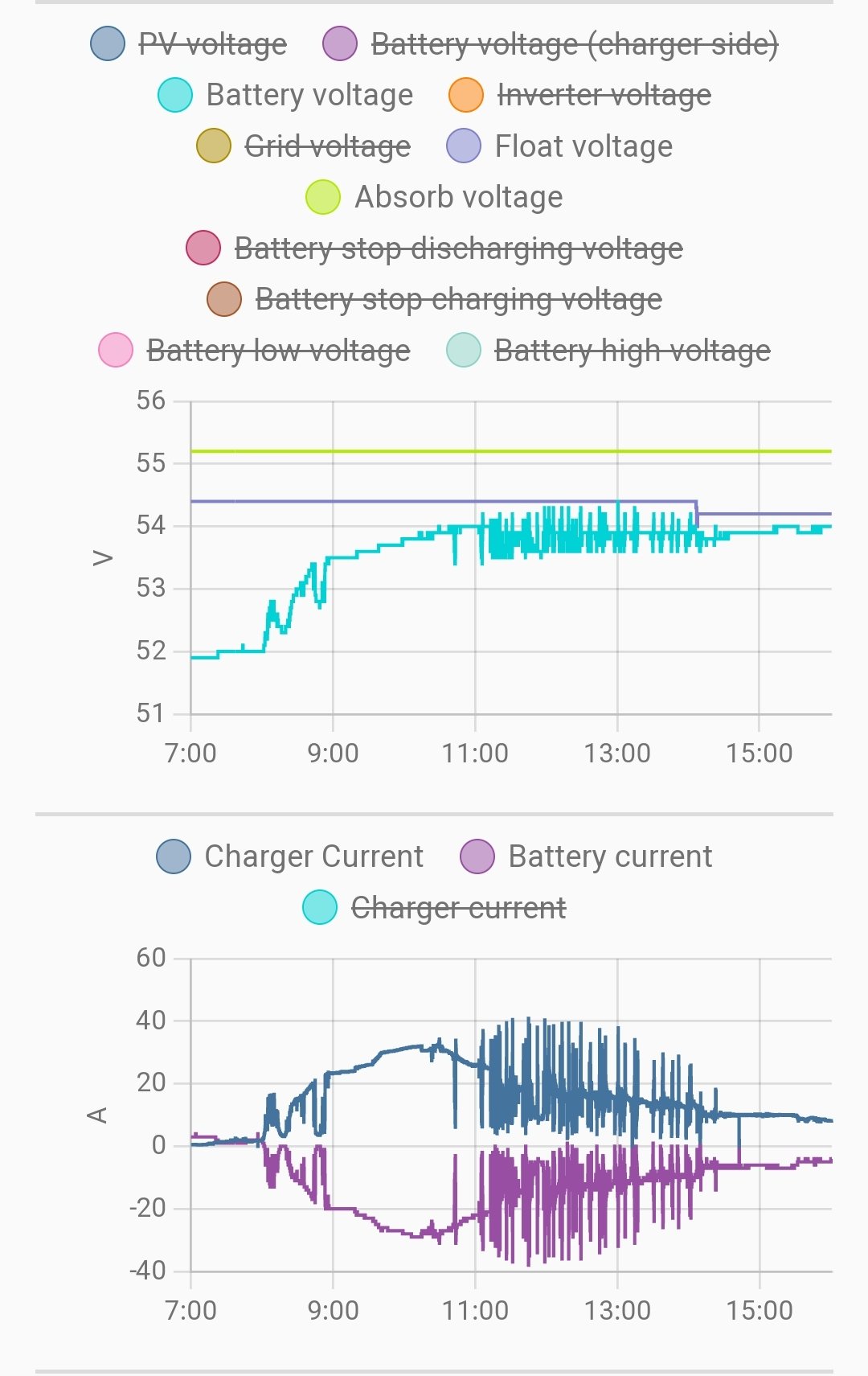 teraz ked pozeram grafy dobijania (3.4. bola bateria rano na 30% a do poobedia ju podla bms dostalo na 100%), ale ani omylom sa nedostala na absorcne napatie ako keby celu dobu menic isiel vo floate a nedosiahlo sa ani balacne napatie 3,38V/clanok, iba to cyklovalo (chvilami vybijalo bateriu vlastnou spotrebou) napriek tomu, ze bolo cely den u nas jasno.