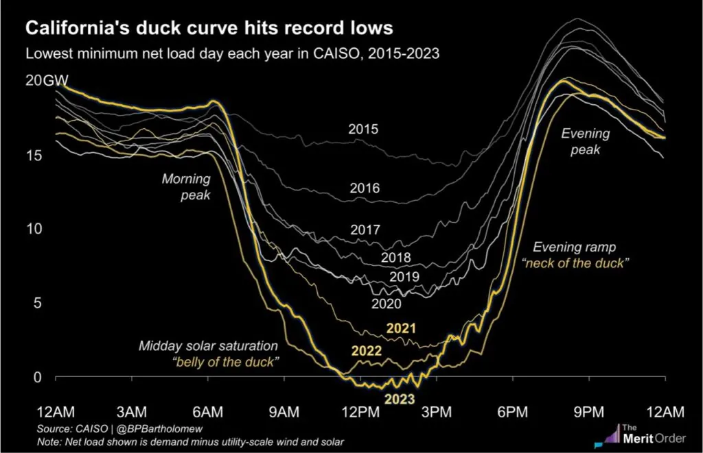 A tady je opak, říká se tomu kachní křivka.Stvořeno pro nabíjemí EV a dělají to soláry v Californíí.Je vidět jak se každý rok prohlubuje.