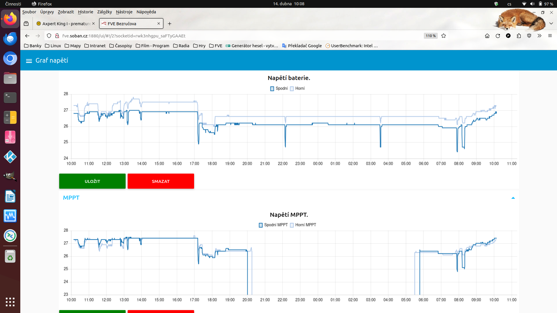 Bylo by skvele kdyby to tak bylo.Po vcerejsim prenastaveni a restartu meniců vse fungovalo jak ma.Bohuzel dnes od sameho rana na menicich sviti kontrolka CHG(baterie je plne nabita).Pritom brzo rano bylo SOC 81% a napeti na baterii 52,7v.Pote co vysvitlo slunicko napeti neprelezlo 53,6(float) a vysledek je ten,ze ackoliv dnes pomerne svitilo,tak baterie je na 90% a kdybych nevyrobil cca 21kwh do prime spotreby,tak se vlastne menic cely den poflakoval.shuty píše: pát dub 12, 2024 7:21 pm
