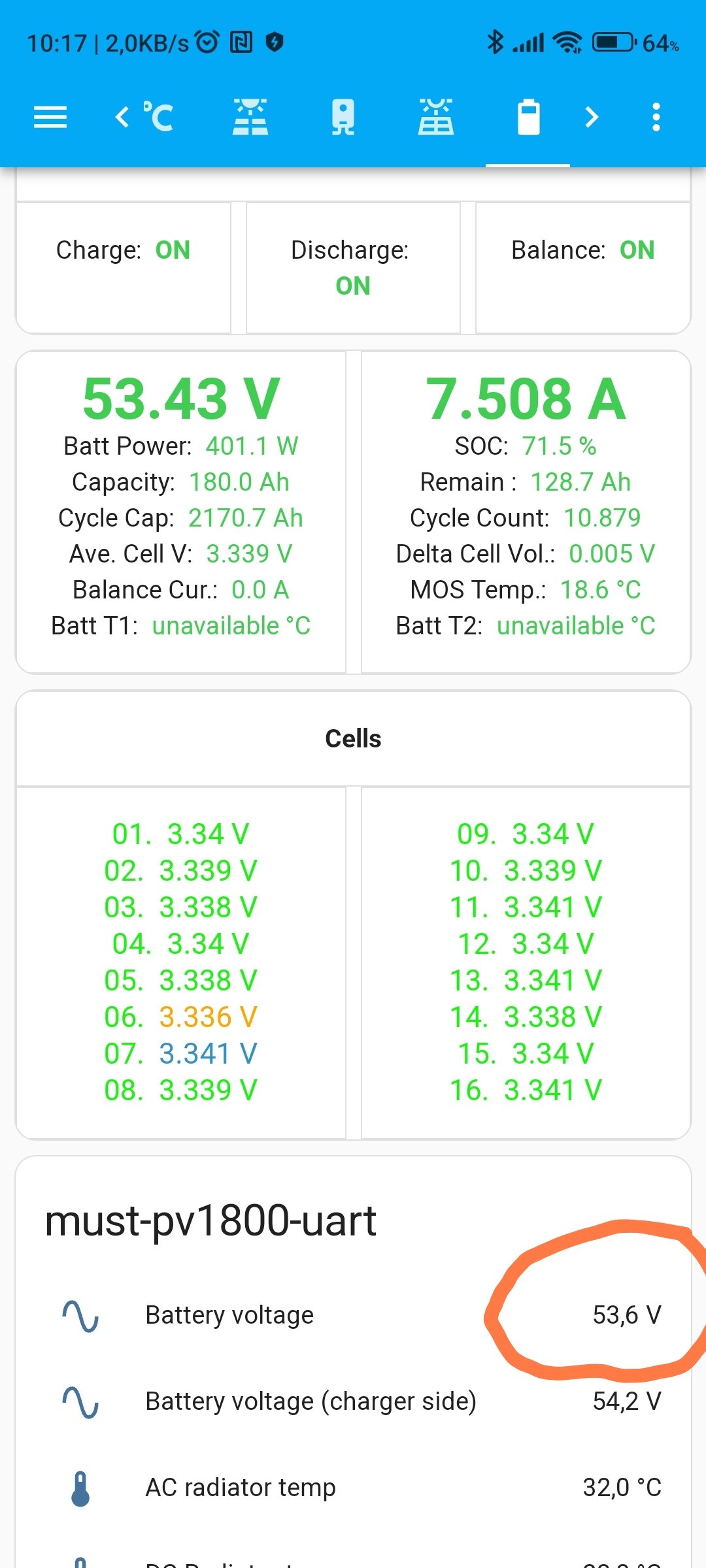 vcera sa mi podarilo prísť domov cez obed, tak som manualne dvihal balanc od 3.38 az na 3.44 a aj stop charging na menici az na 55,9V (potom znizene na 55,2V) (vzdy ked najslabsi clanok dosiahol balancne napatie, tak som pridal 0,1V) a do vecera Must stratil svoje premeriavanie o 0,9V, ktore mal a teraz je o 0,1V nad BMS.