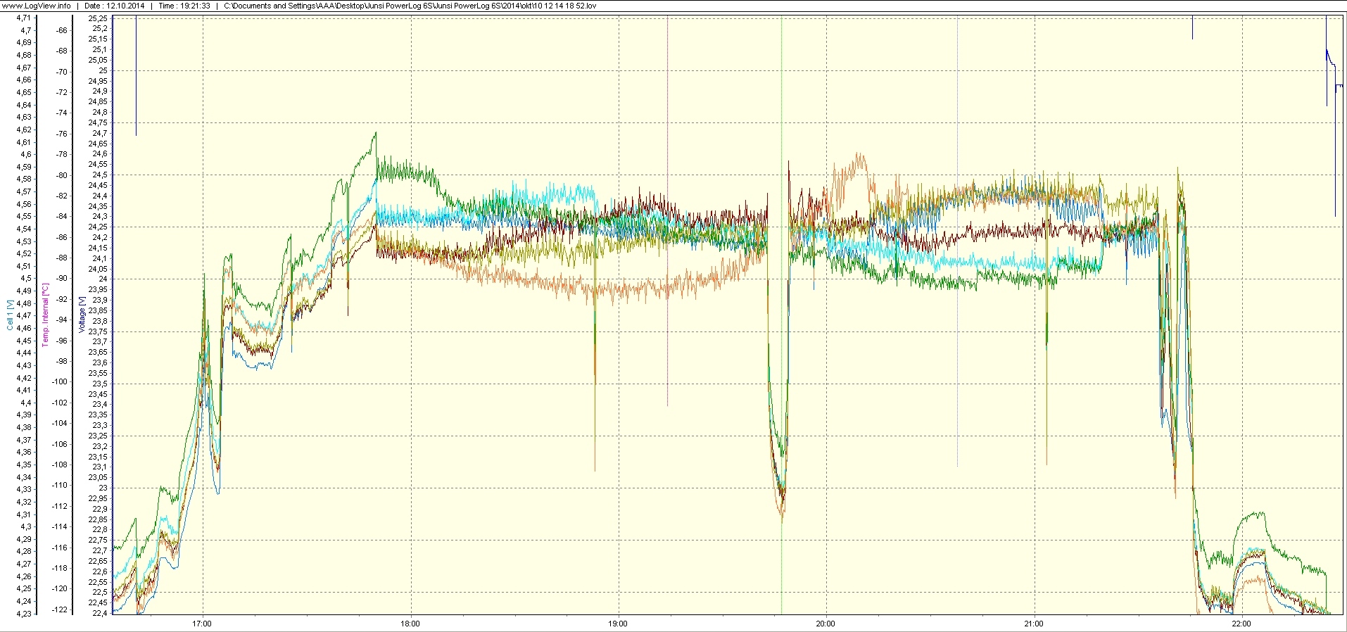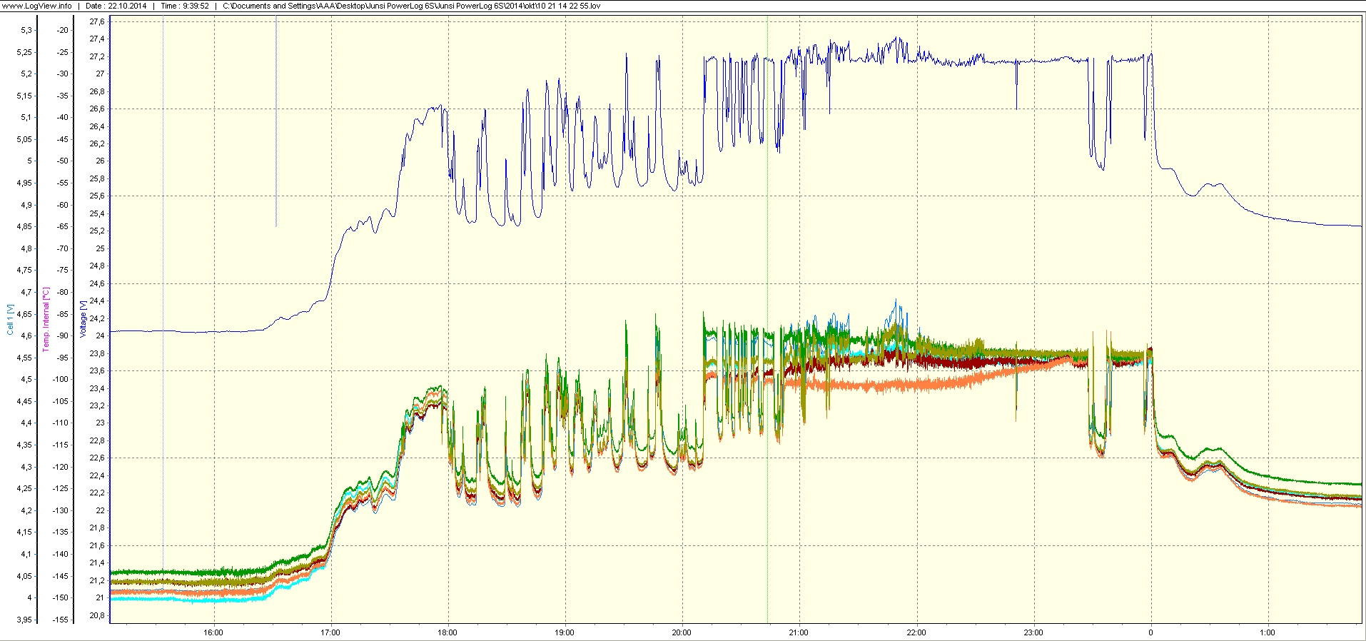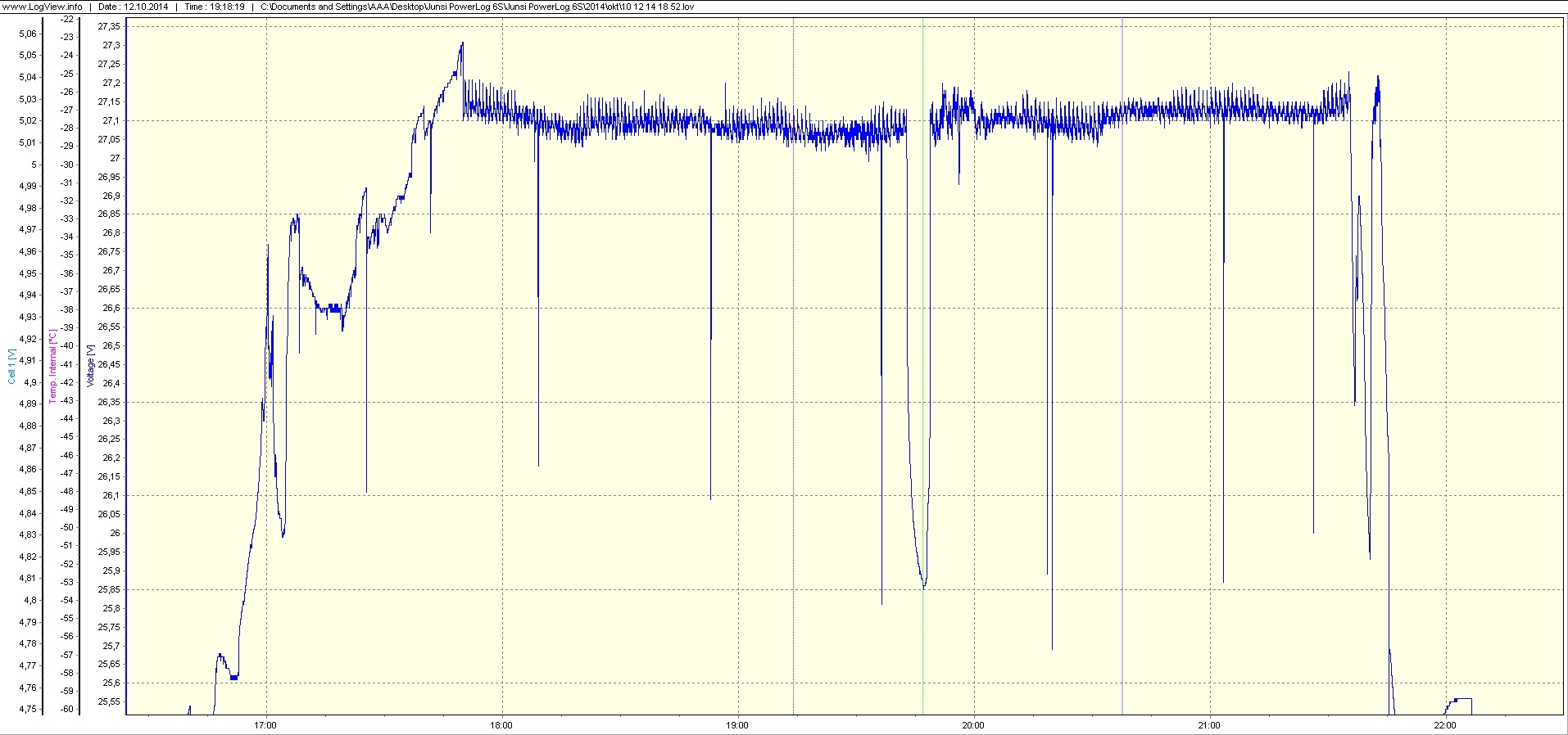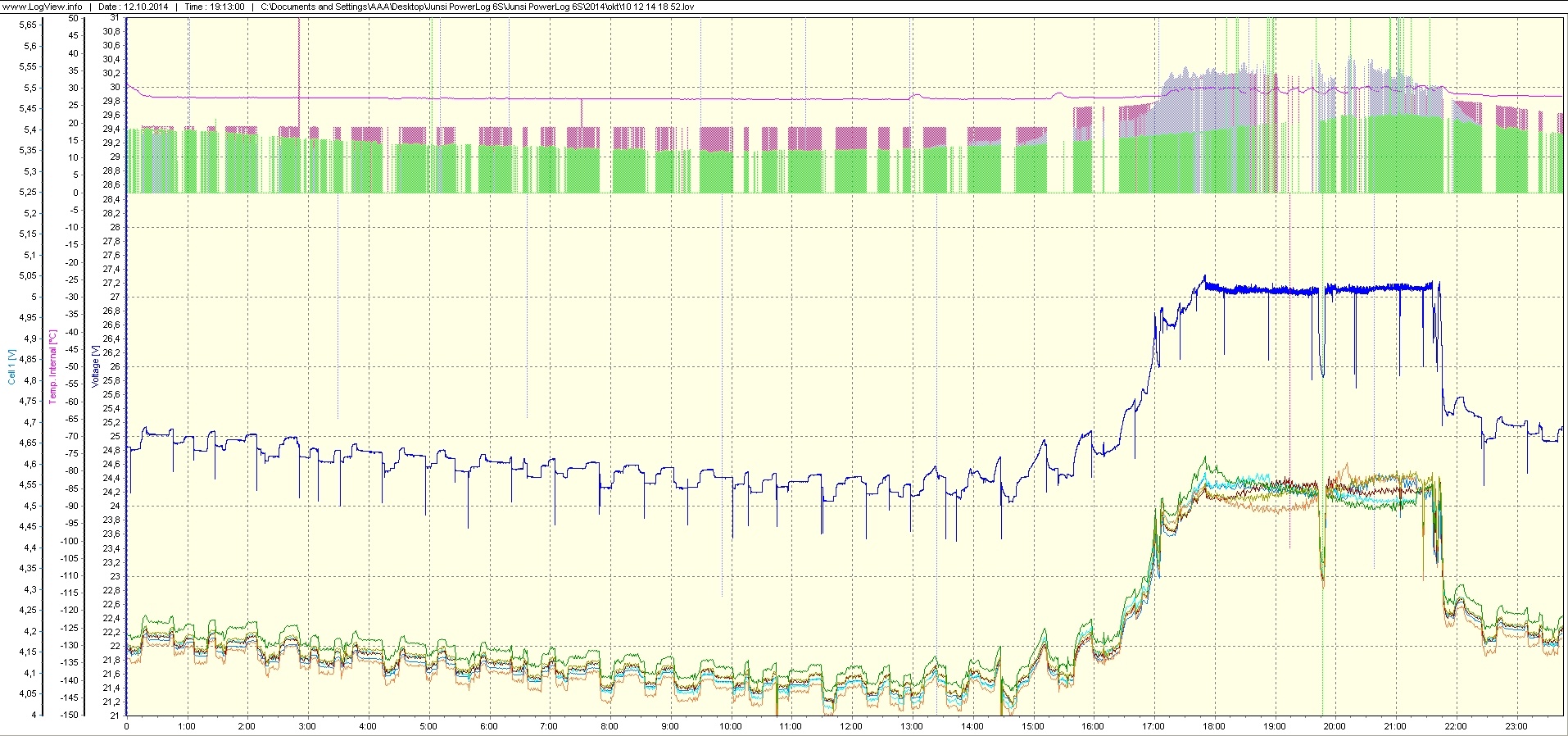 Prvý graf ukazuje priebeh napätí ( aj teplôt ) počas 24 hodín. Nonstop sú pripojené dve mrazničky a jedna chladnička. Najväčší pokles napätia viditeľný na grafe spôsobuje nová testovaná mraznička pripojená na 1000 W meniči ( štartuje pri 55 W a vypína po cca 12 minútach pri 45 W ). Na druhom detailnom grafe je priebeh nastaveného napätia batérie, tesne pod 27,24 V. Aby bolo nastavenie jemnejšie, použil som menší trimer 1 K s predradeným odporom. Napätie je udržiavané po celý čas v rozsahu 27,1 +0,1 / -0,05 V. Na treťom grafe je detail dotrimovania napätí na balancéri, dá sa dosiahnuť šírka pásma menšia ako 0,1 V / 4,54 V. Tesne pred koncom procesu je vidieť už celkom dobrý výsledok nastavenia. Pre všetky obrázky treba použiť na časovej osi korekciu –5 hod. Rušenie pri zázname údajov o teplotách jasne súvisí s napájaním motorových záťaží.