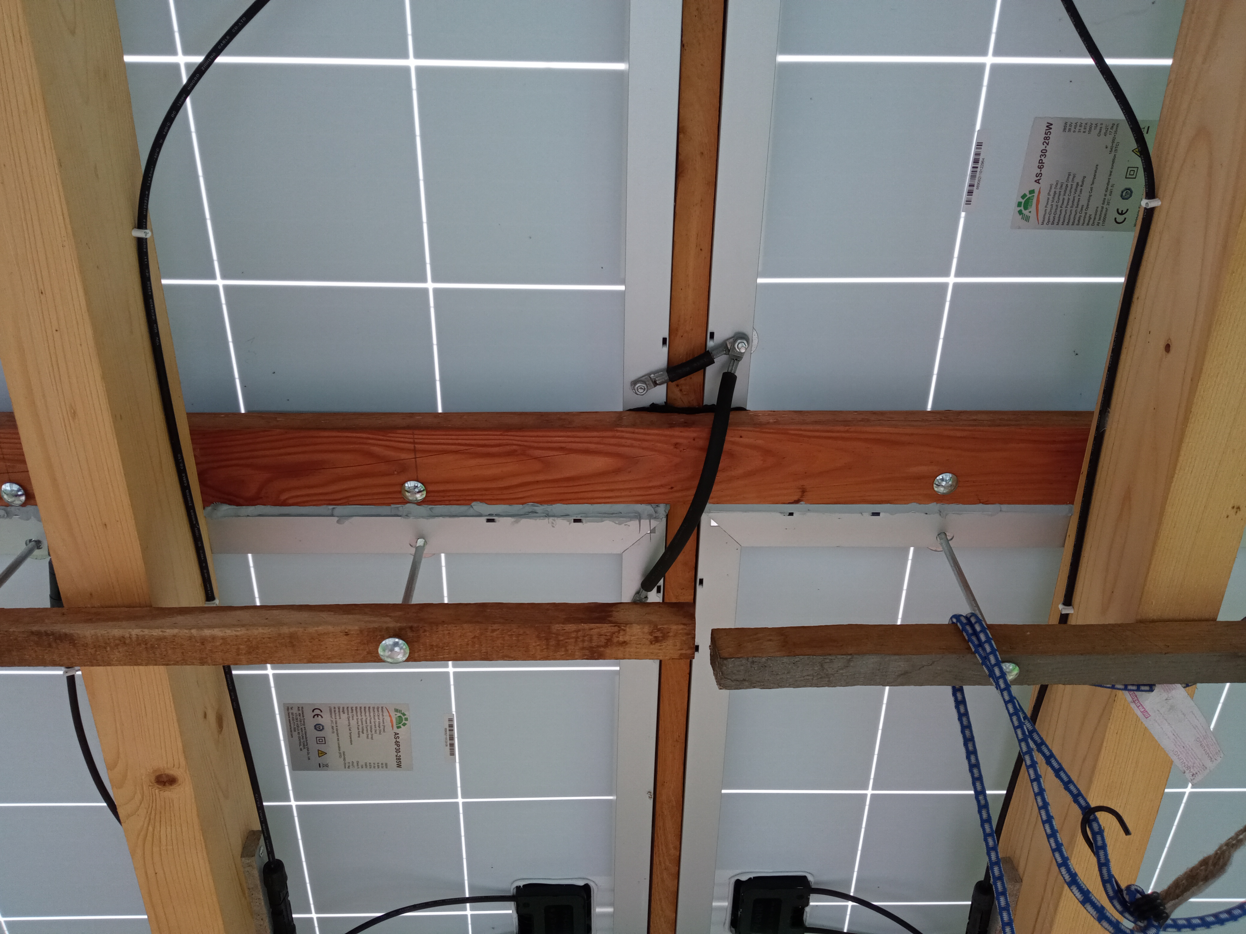 Stavěl jsem malou terasu a střechu tvoří 2x3 panely 285Wp. Vymyslel jsem si svou konstrukci. Na krokve přišrouboval 4 latě 7x3,5 cm z tvrdého dřeva a na ně připevnil panely s překryvem jako tašky. Na dolní straně panel leží na lati, uchycení je vratovým šroubem přes otvory v panelech. Nahoře je lať za panelem, mezera asi 2 mm. Na lať a panel prišla samolepicí guma a přes to plech Maslen. Předtím mezera utěsněna Sikaflex tmelem. A na plech horní panel přes vratové šrouby.