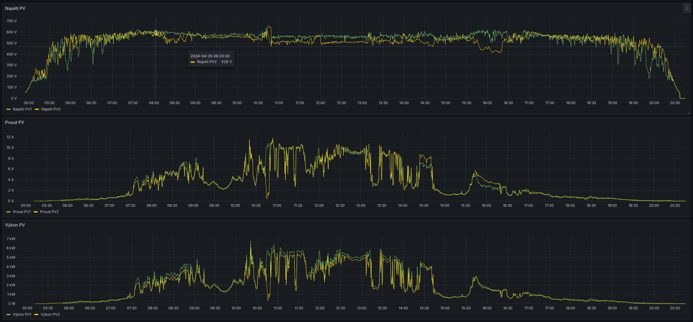 Mám na jedné střeše vodorovně nad sebou 2 stejné stringy po 14 panelech 450Wp (BAUER BS-450-144M6HBB), ale nechovají se stejně. PV1 dává víc (U/I/P) jak PV2, a rozptyl občas bývá velký. Z grafů to vypadá, jakoby občas vypadly až 2 panely.