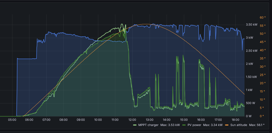 Tak, po přidání panelů a příchodu lepšího počasí se stává můj vytěžovač dost nestabilní. Dokud nejsou nabíté baterky a nebo výkon FVE je menší než příkon regulované zátěže, tak je vše OK, ale v okamžiku, kdy se baterky dobijí skoro doplna a výkon FVE vyroste nad spotřebu, regulátor vytěžovače se otevře na 100% a regulaci převezme MPPT, který usoudí, že baterky jsou full a začne omezovat výkon FVE on, čimž začne celý systém cyklovat nebo se úplně zhroutí.