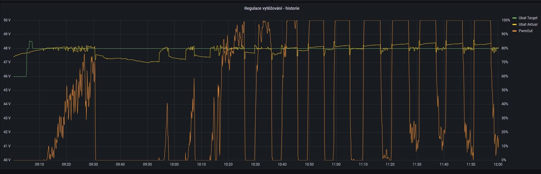 A baterka se přitom dále také dobíjí, pokud je dost výkonu FVE a MPPT nabíjčky se dostanou nad 48V.