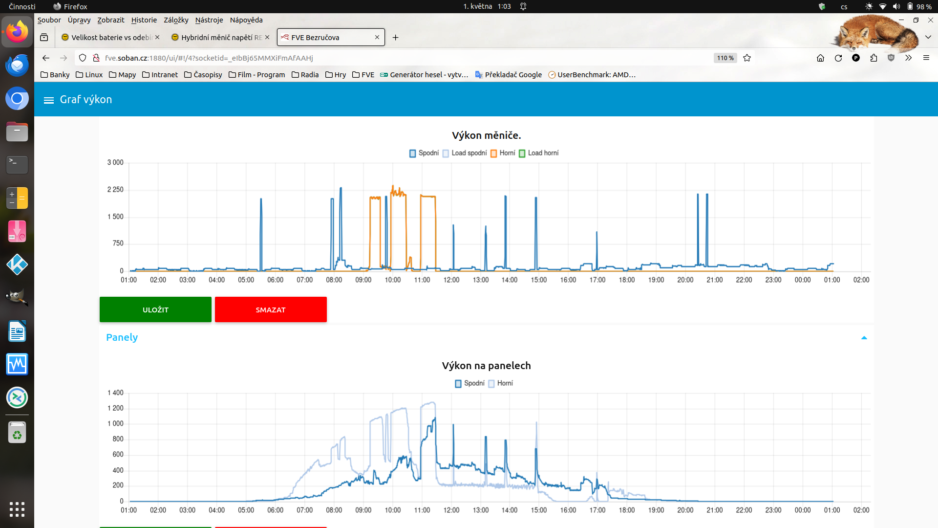 S výkonem 1,5 kWp asi cyklování akumulátoru nezabráníš, pokud chceš ohřívat i vodu. Při správném aprílovém počasí u nás minulý týden chodila výroba v rozmezí 15 - 100% několikrát za hodinu (konkrétně mezi 1,8 a 11kW), když máš spirálu 2kW a výkon FV 1,5kWp, tak popřemýšlej o výměně topného tělesa za slabší (2x500W?) a začít ohřev vody někde nad 60% SoC, jak píše cipis a klidně celý den. Jestli máš Dražický bojler se suchým tělesem, tak jde úpravu provést i svépomocí.emedium píše: čtv kvě 02, 2024 2:13 pmOstrov mám v patře, kde je přes den průměrná spotřeba kolem 250 W/h. Na pergole je místo pro 4 panely s 1520 Wp. Mám ještě protáhnutý kabel do sklepa ke spirále, tak pokud je plná baterka, jde pustit 2x po hodině 5 kW do vody a nemusí se mi zastavovat výroba a zároveň omezí i mikrocykly při floatu. Baterka se ale při 0,5 C trápí, pokud jde polovina (asi 1200 W) zároveň ze solaru, tak už šlape dostatečně dobře. Kapacitu tak potřebuji optimálně navýšit na 10 kWh. 5 kWh v boxech s bms vyšly na 14k tak už to není taková pálka
