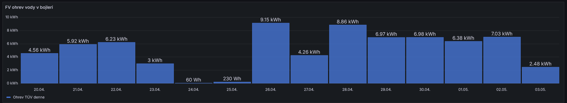 Má jednu volnou spirálu, tak jsem na ni zkusil na podzim připojit bazénové tepelné čerpadlo. To ale umí max. 42 C, kupodivu to fungovalo, Ale jen pro sprchování 38 C. za den to spotřebovalo jen 2.5 kWh. Bohužel nejelo dlouho, protože když mu klesně teplota okolí pod 15 C přestane fungovat. Ještě je pak varianta s invertorem do -10 C, ale když je tam zima, tak není moc z čeho brát a jede to místo 3 kW na 700 W tep. výkonu jako pidi elektrokotel. Takžespíš přemýslím o výměně za bojler s tep. čerpadlem, které ale dohřívá na 60 C.