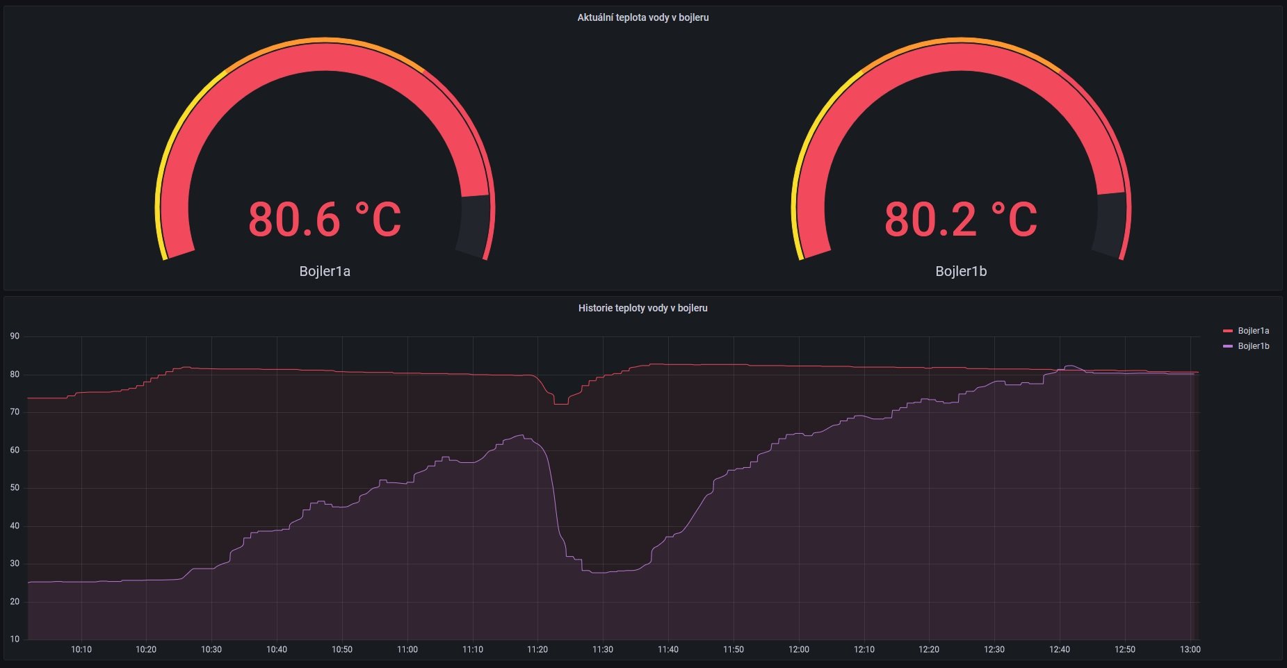 13:00 hod. Bojler ohřátý na max. Baterka nabitá taky téměř do plna. Protizátěž (trouba) má taky splněno.