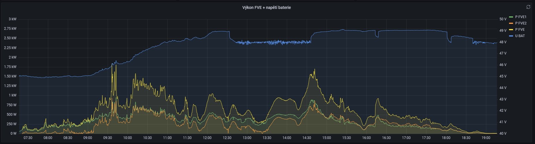 Jinak aktuálně testuju variantu, že bojler je i v tomhle přiznivém období připojen na FVE přes vytěžovač nastavený na těch 48V a nahřívá se vlastně nonstop. Má to pro mne 2 zajímavé efekty. Za prvé se bojler začne nahřívat až už je skoro nabitá baterka a za druhé když se zamračí a začne klesat napětí na baterce, tak vytěžovač bojler odpojí a čeka na příznivější podmínky. Stejně tak když se zapne nějaký výkonný spotřebič a není momentálně výkon v panelech. Takže mi baterka nevydrží možná 15 let ale 30. Ale to už možná budu potřebovat jinou menší baterku
