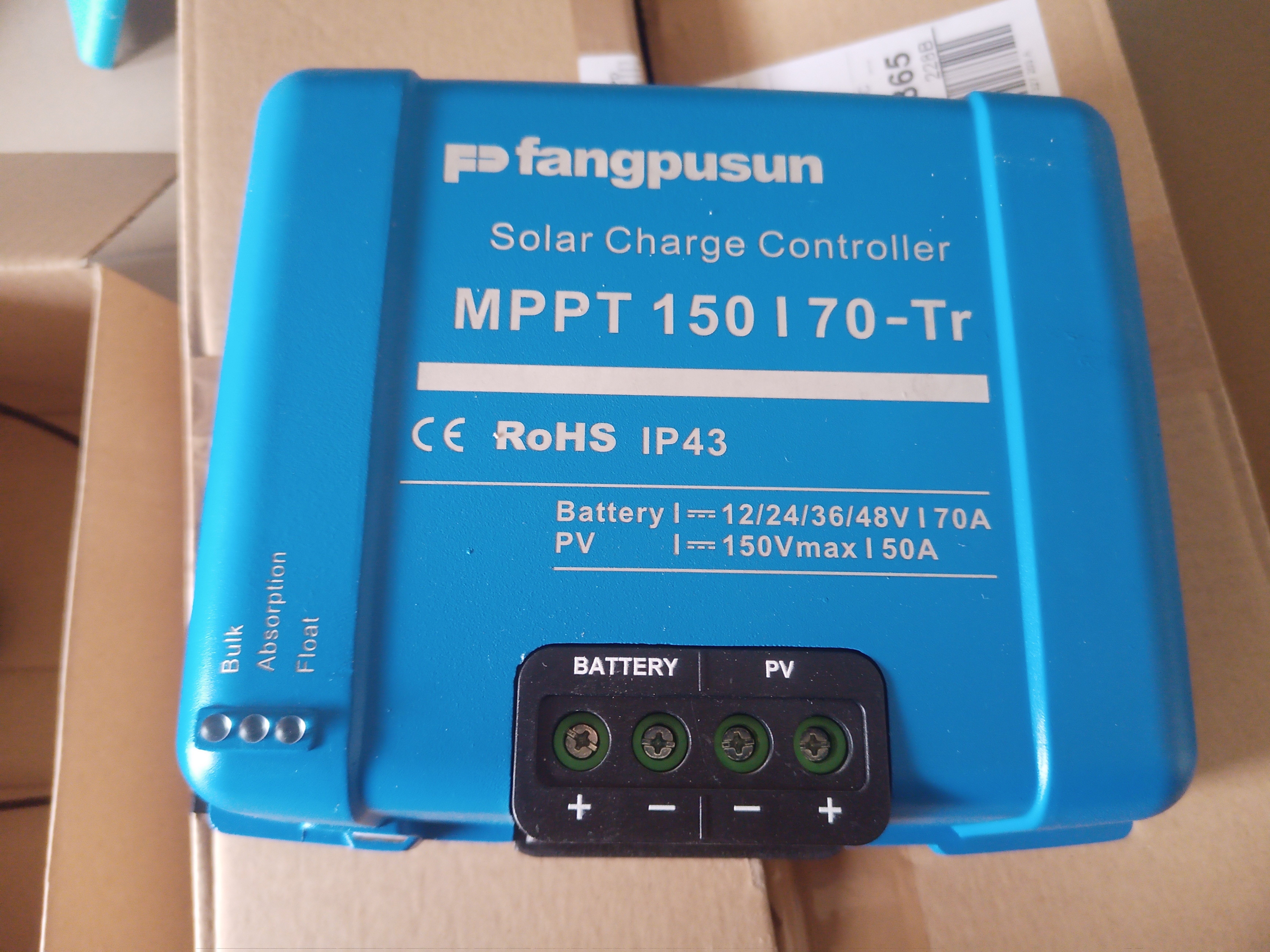 Nabízí se regulátor Fangpsun MPPT 150/70 s maximálním vstupem 150 V a proudem dobíjení 70 A, vhodný pro baterie 12-48 V. Zařízení obsahuje nastavovací displej a je kompatibilní s LiFePO4 akumulátory. Regulátor je prakticky kopií značky Victron a je dostupný v lokalitě Brno venkov, s možností zaslání. Cena byla 5000 Kč, ale regulátor již má nového majitele.