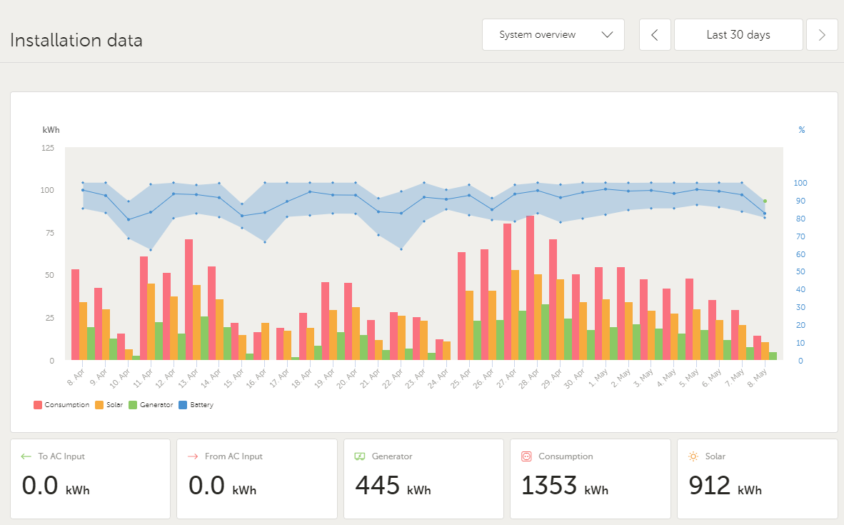 Spotřeba elektřiny nejčastěji mezi 12 a 30kWh, 27.4. jsem měl rekord, skoro 53 kWh. Koukat na Solar, Consumption počítá špatně. protože přičítá výrobu druhého střídače.