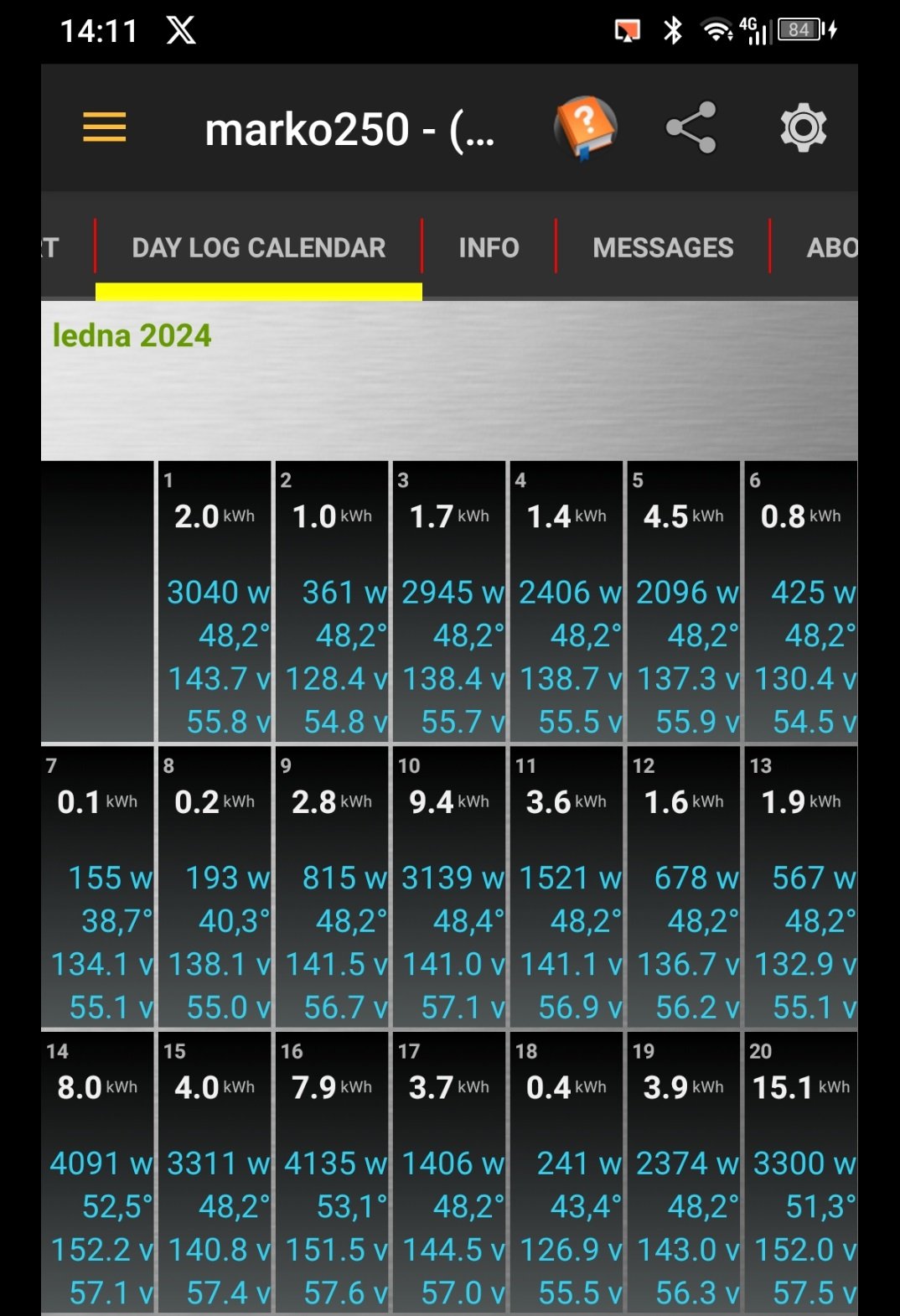 Tak první měsíc roku 2024 mám za sebou za měničem svítí 46.82 MWh,za leden tedy bylo spotřebováno v domu 330kWh z FVE a 83kWh z DS.Výroba JZ střechy: