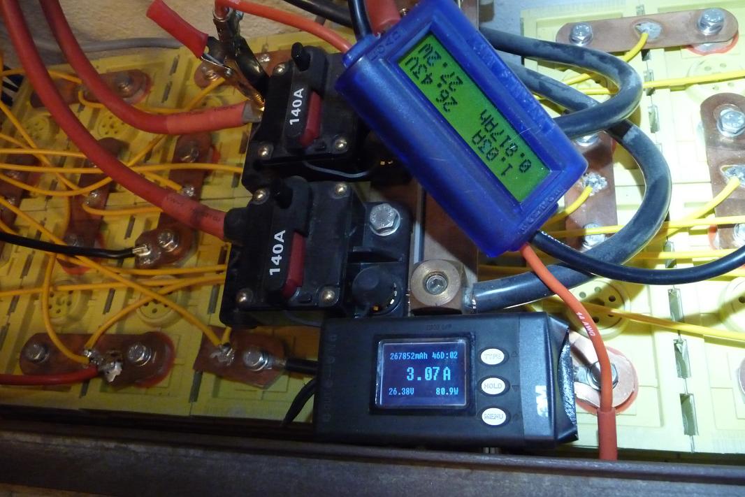 Modrý Wattmetr (zhůru nohama) měří proud protékající tlustým "modrým" drátem společný mínus od panelů , svítící Power-log měří proud do baterky