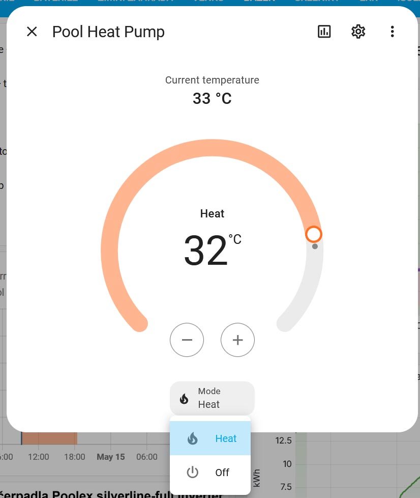 Moje bazénové tepelko má displej na kabelu. Ale z něj to ani nedovedu ovládat. Pomocí kombinace kláves se musí odemknout a pak se bloudí pomocí pěti tlačítek v menu. Pohodlnější je to ovládat v HA z počítače, mobilu jako termostat: