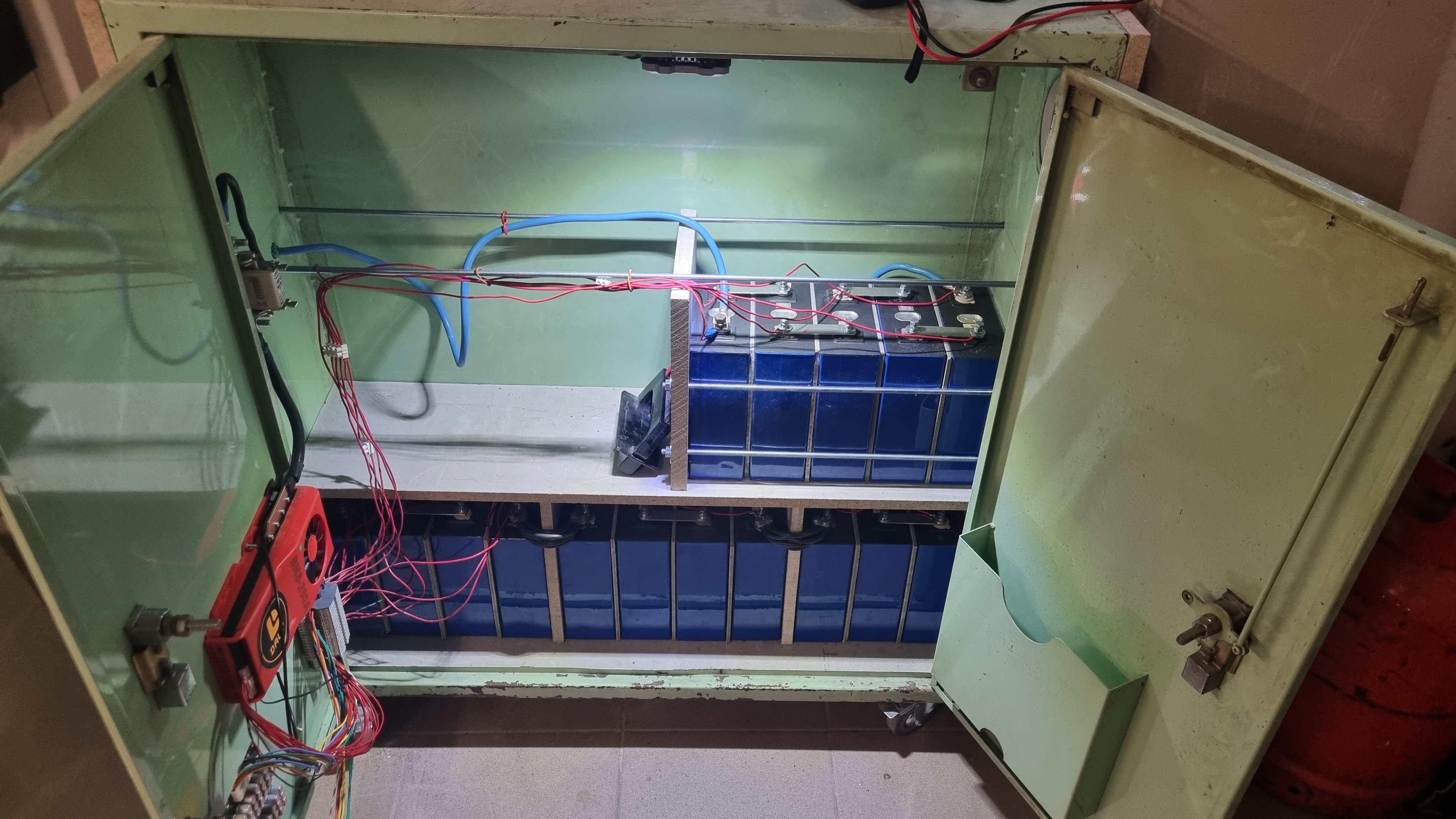 Tak jsem po letošních požárech baterii, předělal i tu moji Lifepo4.Rozvadęč je na kolečkách 2m od garážových vrat a dá se lehce vytlačit ven. Každý článek je oddělený cetrisem. Možná baterie na léto převezu ven za zeď v mrazech budou v garáži.Ještĕ musí koupit nějakého andersona na odpojení a časem doplnit 16 ĉlánků.