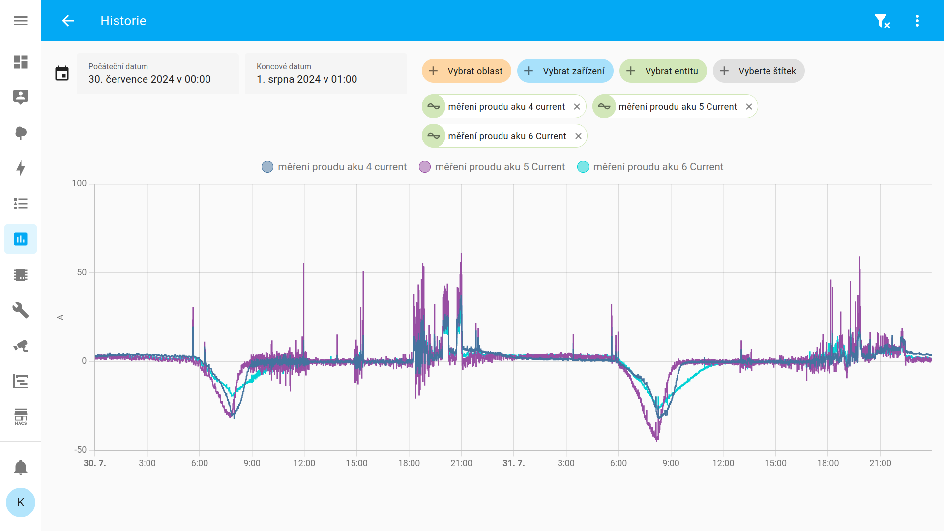 Nakonec nejuniverzálnější a nejlevnější je si to poskládat sám. Namátkou tady mám pod ESPhome měření DC proudu s INA226. Takto to vypadá ve webovském prohlížeči, když to přicvaknu na bočník, přes který jde vše z baterií: