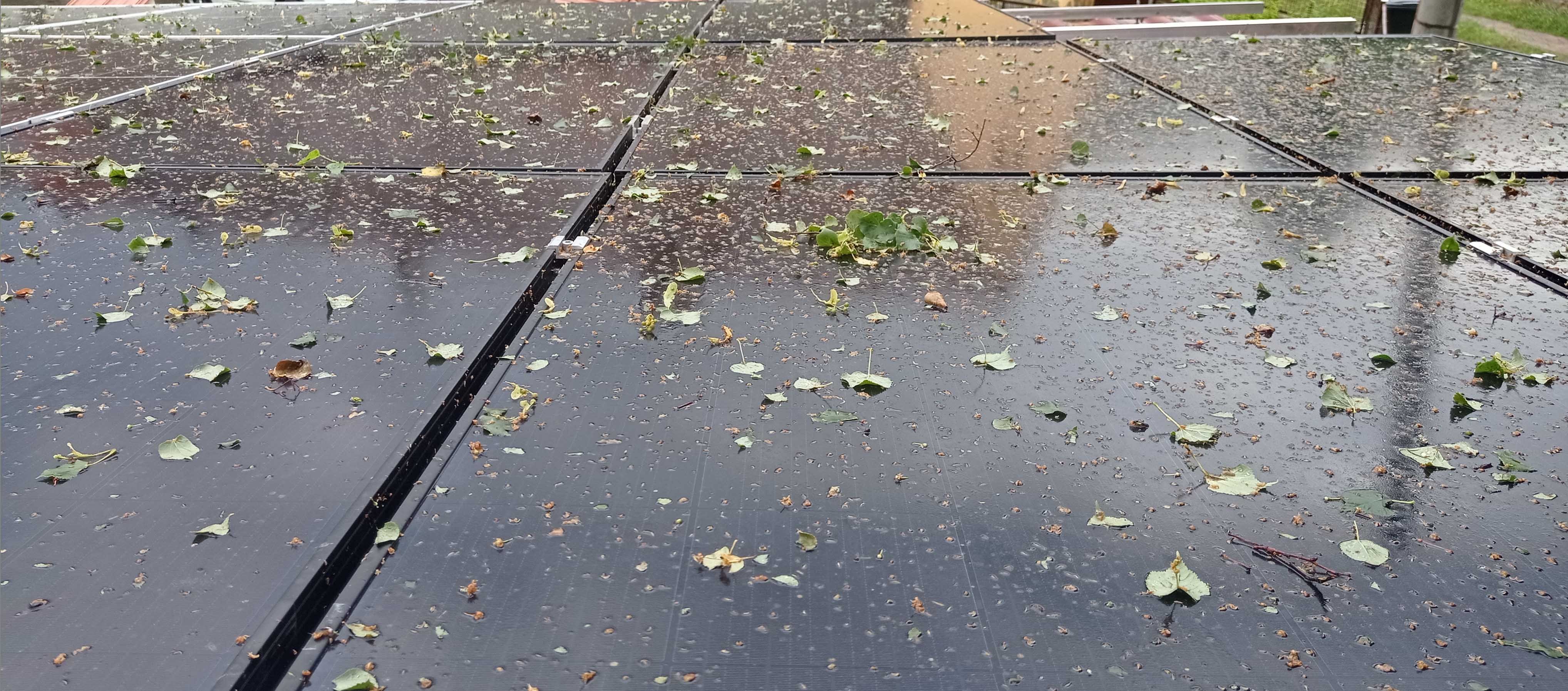 Vypadá to, že všech cca 150 FV panelů přežilo. Jen je na nich bordel ze stromů, tak jsem to ještě za mokra vzal hadicí, aby se to nepřilepilo. Z lípy to je samá medovice a to pak skoro nejde dolů.