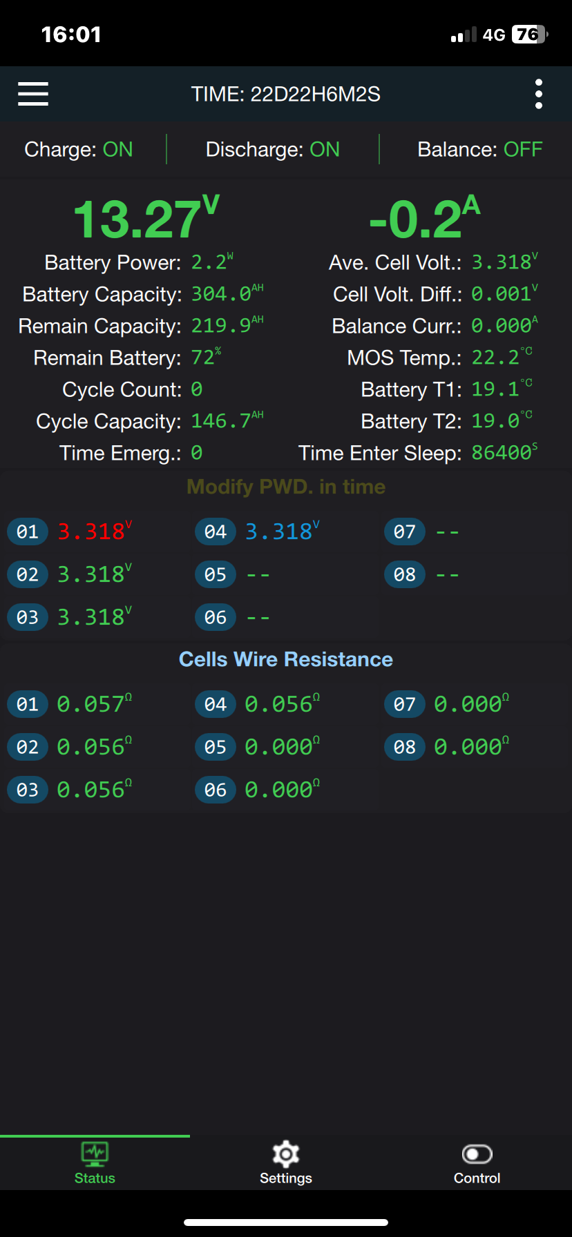 Zatim ano, sehnal jsem ho od znameho, planuji koupit dve 500wp..to by uz melo stacit ne? No to nastaveni prave nevim jak udelat, taky nebim jestli to bmsko je dobre nastavenyFRSO píše: čtv čer 06, 2024 3:40 pmTo máš jen jeden panel 190Wp na ten solární systém 12V 1kW ?? regulátor bude asi PWM, takže panel moc výkonu asi nedá. Ještě záleží na nastavení nabíjení a jak je nastavená ta BMS-ka. Jaké je napětí na akumulátoru když to nenabíjí ?TajgrWoods píše: čtv čer 06, 2024 2:29 pmAhoj lidi, mam na chate solar 190wp baterie lifepo 320 ah 12v menic PS1KVA , bms jikong, menic normalne funguje ale solar nenabiji, doma baterii pres menic nabiju ale na chate sviti jen ikona panelu ale nesepne se charging, potreboval bych od vas zkusenych poradit co s tim, jestli je to v nastaveni menice, nebo je spatny solar? Ten ukazuje treba 22v pres den v menici, takze tipuji ze by mu nic byt nemelo. Dekujiimage.jpgimage.jpg