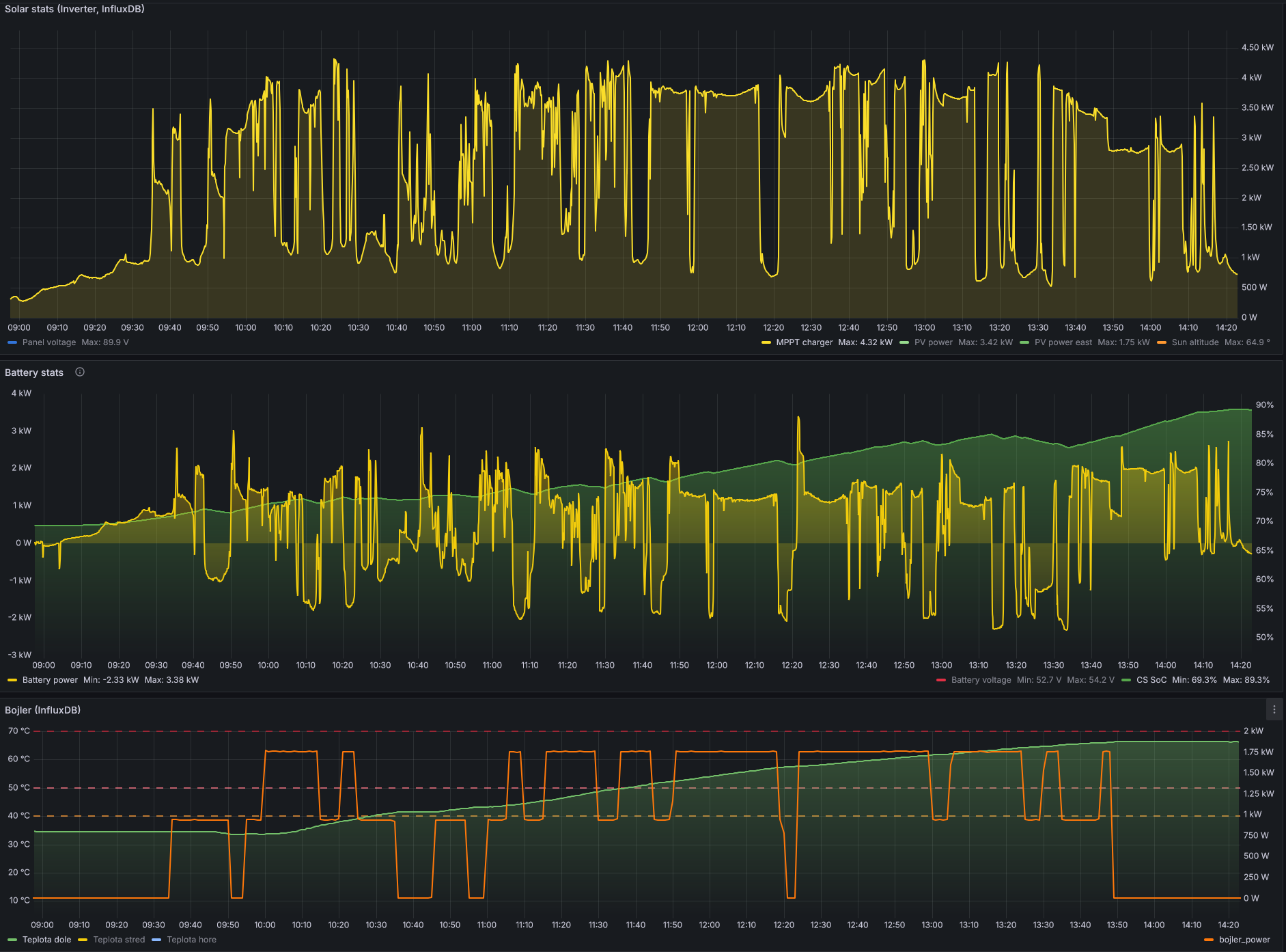 Analógové SSR a riadenie z HA v sekundových intervaloch by nebolo úplne márne, ale LFP skôr odídu na starobu ako na počet cyklov (aj s mikrocyklami). Prikladám graf nahrievania bojleru zo včera, pekne vidieť výkon z MPPT, odber bojleru a výkon z/do batérie. Tých mikrocyklov je tam habadej, ale vôbec sa z toho nejdem zblázniť.