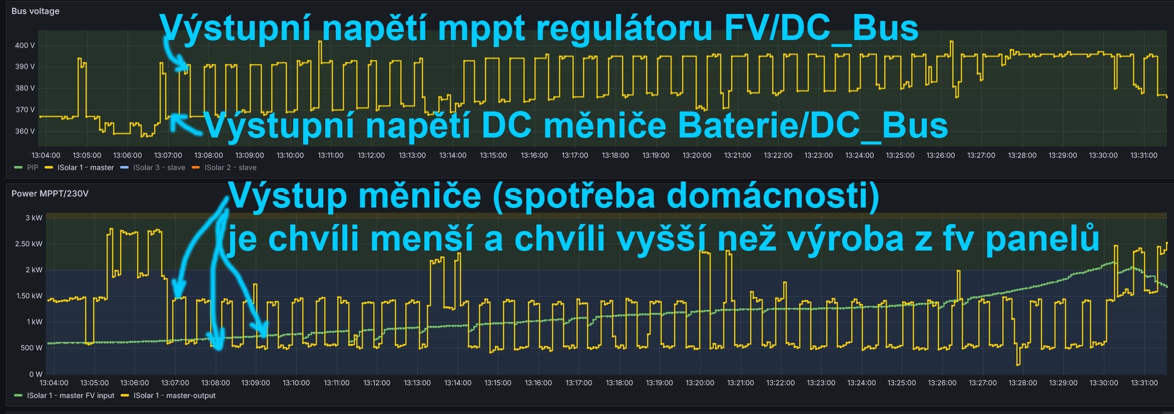 Ty hranice napeti pri kterych se nabiji nebo vybiji nejsou konstantni, ale jsou dane napetim baterie a pak tim pomerem nasobeni DC/DC menice. Pokud jsou baterie jiz ve floatu a nebo v omezeni nabijeciho proudu, tak napeti na BUS zacne stoupat nahoru. Pokud dosahne hodnoty 470V, tak MPPT regulator opusti bod maximalniho vykonu, zacne menit svuj duty cycle spinacich prvku a posouva napeti na PV vstupu nahoru a snizi odber vykonu z panelu.rva píše: sob čer 01, 2024 3:17 pmMptt regulátor je nastaven na vyšší napětí než měnič z baterie a proto je při dostatku solární energie napětí na této sběrnici vyšší (cca 390V) a tato sběrnice není napájena z baterie.