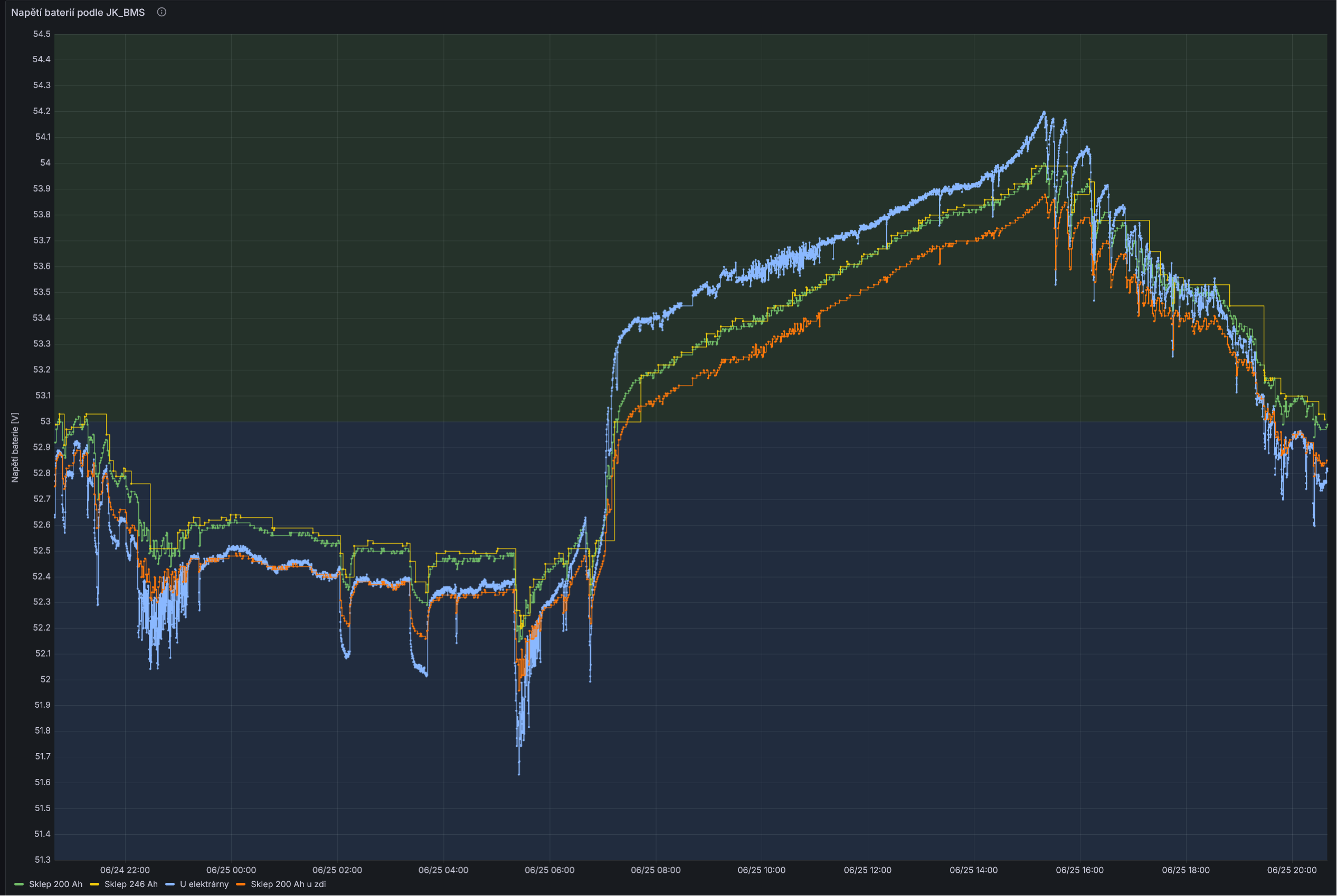 Co se týče MakeSkyBlue tak momentálně používám 4 ks a mám nastavené ukončené nabíjení při napětí 51,7 V . Pylontechy mi při ukončeném nabíjení ukazují SOC 94-95%. Žádné VT ani VS v systému nemám a funguje to spolehlivě. Pro případ selhání MPPT nabíjení mám hlídaní napětí na 52 V, kdy dojde ke shození DC jističů od panelů vyrážecími cívkami. Zatím takový stav nenastal, ale člověk nikdy neví.