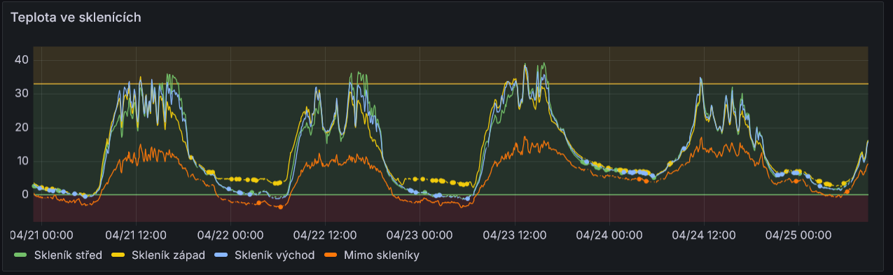 Ten největší (skleník západ) jsem v noci ohříval 1000 W za těch stoletých mrazů, kvůli kterým nebude úroda. Podívej se, jaký vliv to mělo na teplotu. Spínala to automatika aby uvnitř nemrzlo