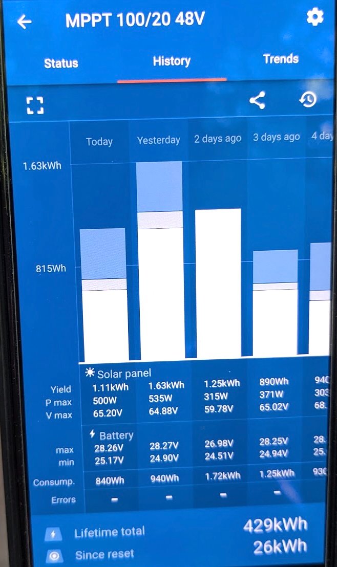 ostrov skoro 8kWp neustále ve stádiu zrodu: smartshunt(ex WBJR), MPPT150/45, MPPT 250/100(ex midnitesolar 150 clasic lite), 16S a různě P cca 340Ah Winston, MP II 5000,( ex Powerjack 8kW, ex samodomo cca 4kW). 48V DC rozvody a spotřebiče.