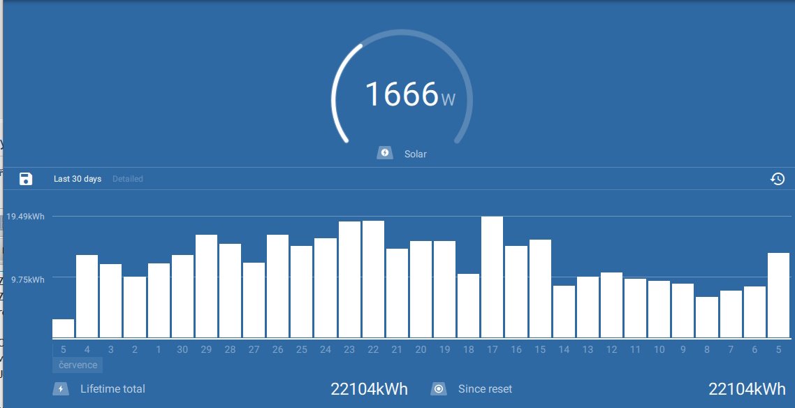 5,4 kWp JJZ 4deg,1,8kWp JV 24deg, do 13.8.2022 bylo 3,6 kWp, MPII 5k, Victron MPPT 250/85-TR, aku 9,45 kWh Lion 15S, BMS 200A, Smart Shunt 500A.