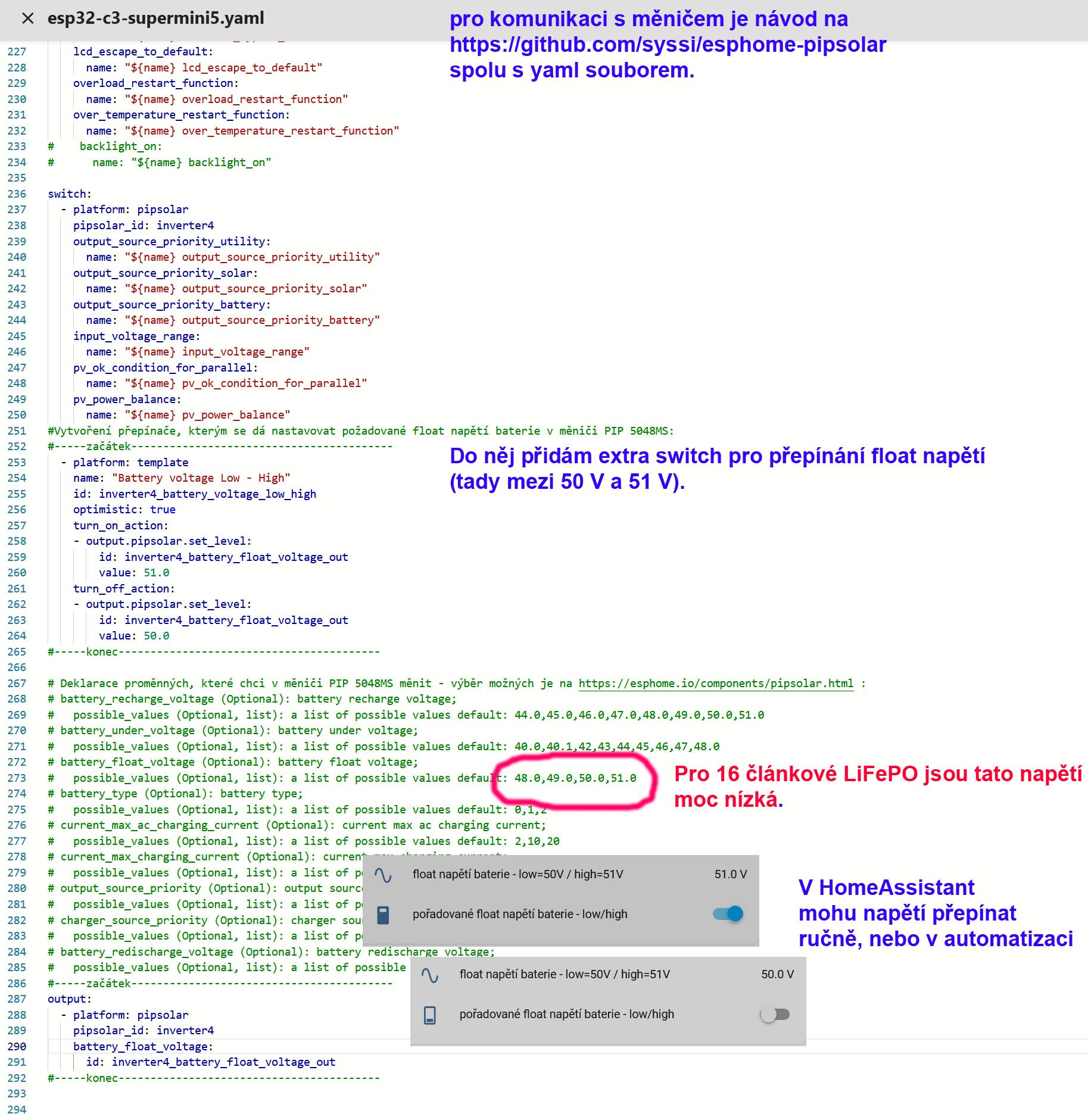Já jsem natvrdlý a když něco dělám poprvé, tak to dělám desetkrát. U jednoho PIP5048 jsem to zkusil nastavit. Snad část output z yaml, která se toho týká: