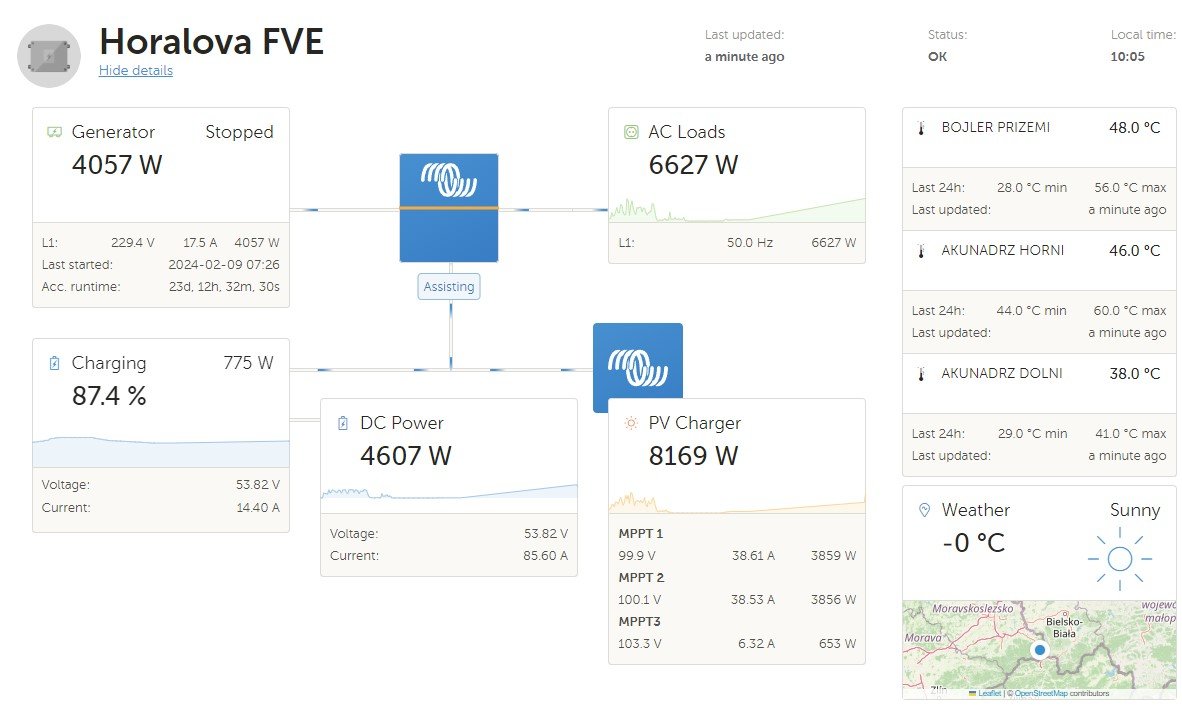 9,2kWp JV 45°, 4,6kWp JZ 45°, 2,3kWp JV 90°, 2 x Victron MP II 5kVA, 3 x SmartSolar 150/70, Smartshunt, Cerbo, 16x280Ah + 16X300Ah + 16x300Ah LiFePO4 + 3xJK BMS.