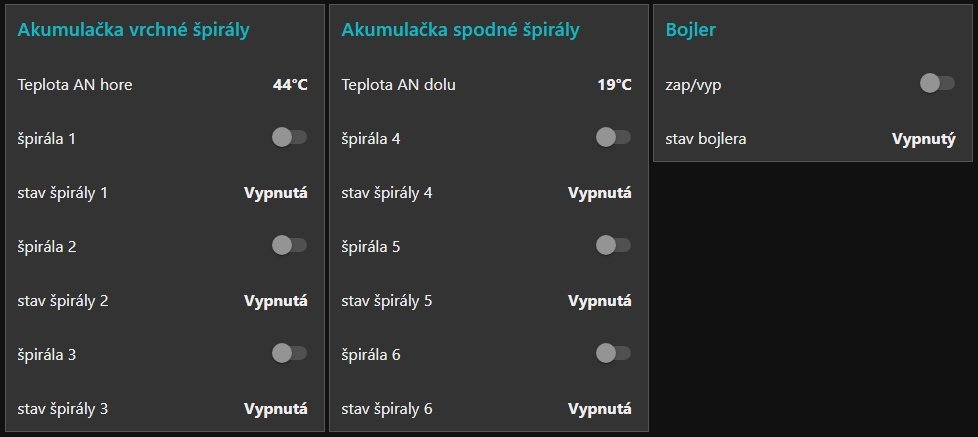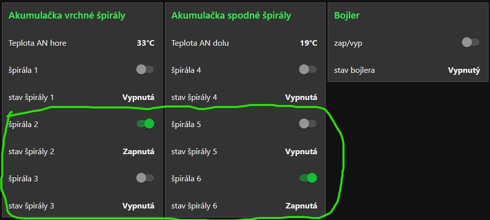 Špirála 1 a špirála 4 su ovládané s 2x relé cerba a špiraly 2,3,5,6 su z relé modulu ESP. A bojler je ovladany zasa z relé bmv712.
