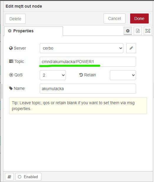 do kolonky topic vlozime text alebo prikaz (alebo ako sa tomu hovori ) to co chceme vycitavat z modulu, cize chceme vediet stav konkretneho rele,bud 1, 2, 3 alebo 4 co je zopnute/vypnute a to tak ze tento kod si vycitame na samotnom module v casti console.skopirujeme a vlozime,este si natavime name vtomto pripade akumulacka a potvrdime v pravo hore done. 3:toto iste spravyme aj v node mqtt out ale stym rozdielom ze do topicu musime zadat prikaz v tvare CMND vsimnite si ze vycitavame a pracujeme stale iba s POWER1 cize iba rele1.