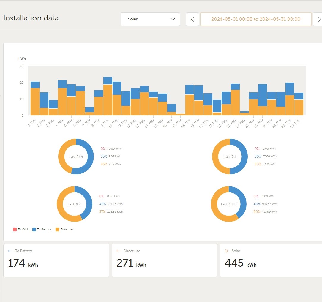 V poledne mám občas špičky 10 - 11kW, a ještě 6x385Wp v garáži, co přijou na JV fasádu, pro posílení zimní výroby, když mám střechu zastíněnou stromy.
