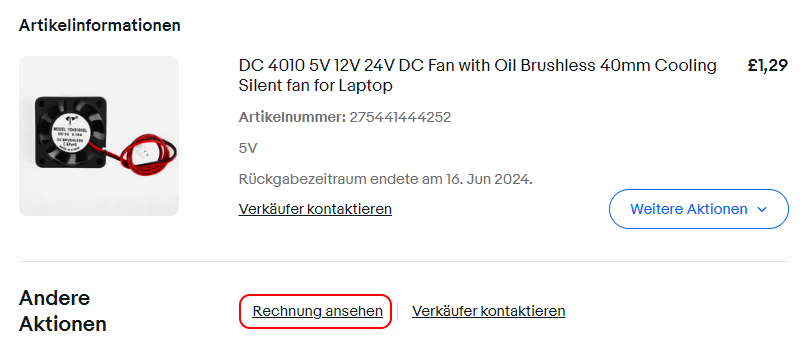 Nakupuji i prodávám na Ebay již delší čas, ale v německé verzi Ebay tuto volbu nemám.Valdano píše: čtv črc 11, 2024 1:21 pmPo nákupu na eBay máte fakturu v podrobnostech objednávky. Stačí tedy ve Vašem účtu na eBay přejít u té objednávky na "Zobrazit podrobnosti objednávky" (View order details) a tam pak najdete odkaz na "Zobrazit daňový doklad" (View tax invoice) což je zobrazení elektronické faktury přímo k danému nákupu. Tu fakturu si pak můžete třeba vytisknout na papír a nebo do PDF pro uložení. Jinak prodejci na eBay často žádnou papírovou fakturu vůbec neposílají a jediná k dispozici k danému nákupu je právě jen ta elektronická co je na ni odkaz v podrobnostech objednávky po nákupu přímo na eBay.JirkaE píše: čtv črc 11, 2024 12:28 pmEdit: projel jsem rychle všechny bedny a obaly - faktura žádná![]()
