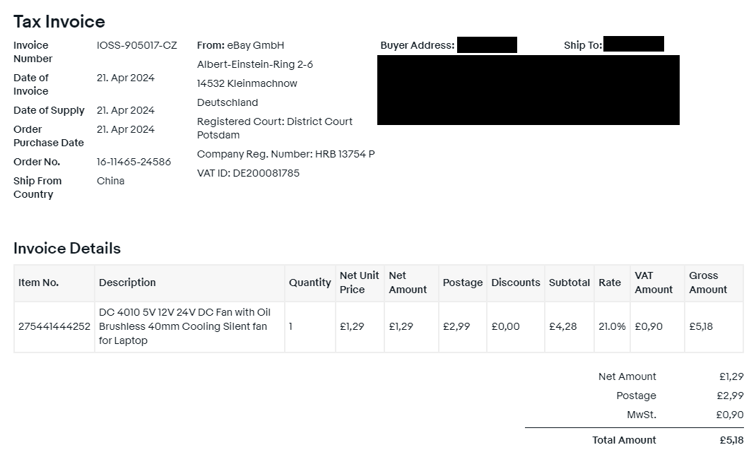 Po nákupu na eBay máte fakturu v podrobnostech objednávky. Stačí tedy ve Vašem účtu na eBay přejít u té objednávky na "Zobrazit podrobnosti objednávky" (View order details) a tam pak najdete odkaz na "Zobrazit daňový doklad" (View tax invoice) což je zobrazení elektronické faktury přímo k danému nákupu. Tu fakturu si pak můžete třeba vytisknout na papír a nebo do PDF pro uložení. Jinak prodejci na eBay často žádnou papírovou fakturu vůbec neposílají a jediná k dispozici k danému nákupu je právě jen ta elektronická co je na ni odkaz v podrobnostech objednávky po nákupu přímo na eBay.JirkaE píše: čtv črc 11, 2024 12:28 pmEdit: projel jsem rychle všechny bedny a obaly - faktura žádná![]()