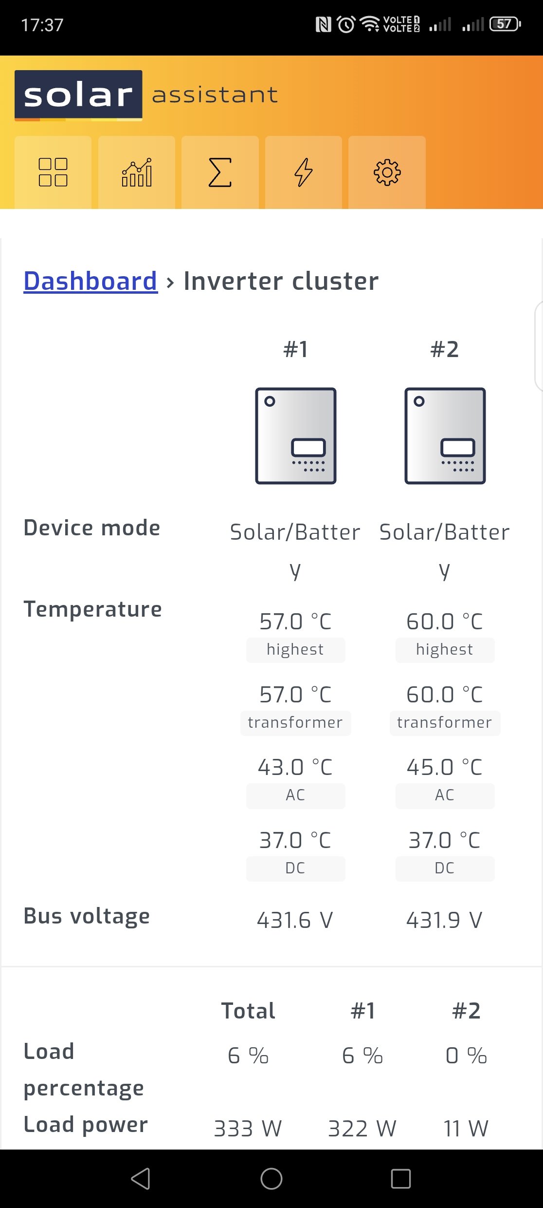 Mám dva ventilátory dole, horní tam není. Ventilátor se nezastavuje,pokud teplota stoupá nad 60 st, zvýší se otáčky na max.Záleží na tom jaký je odběr a jak dlouho,pokud to jde z panelu tak teplota něco málo přes 60 st.Pokud už není energie z panelů a dělá se konverze 48/230V a je velký odběr tak teplota i 70-80 stSoban píše: pát črc 12, 2024 10:23 amPodle mě by to tedy chtělo lepší řízení.....