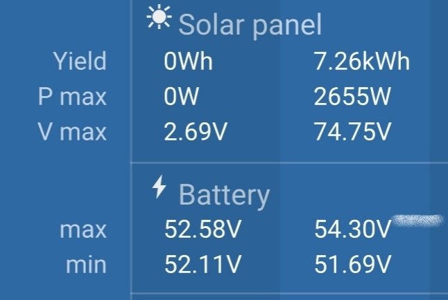 5,4 kWp JJZ 4deg,1,8kWp JV 24deg, do 13.8.2022 bylo 3,6 kWp, MPII 5k, Victron MPPT 250/85-TR, aku 9,45 kWh Lion 15S, BMS 200A, Smart Shunt 500A.