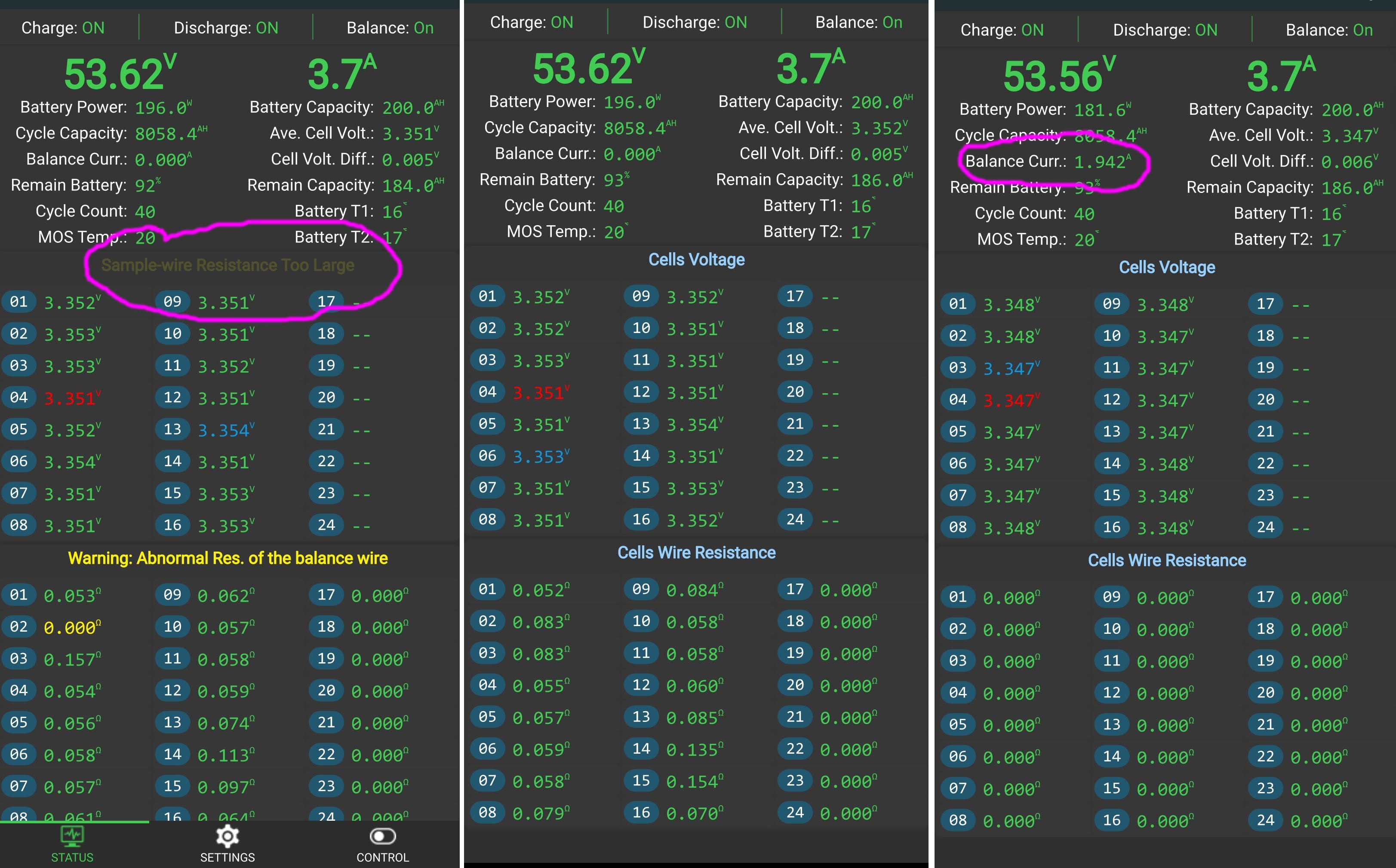Tak problém vyřešen. Mohl za to vysoký přechodový odpor jednoho balancovacího vodiče. Originální kablíky byly krátké a tak jsem na ně nakrimploval prodloužení a časem se u jednoho ukázal vysoký přechodový odpor. Na změření napětí článků to stačilo, ale kvůli tomu to nebalancovalo. Po opravě je i balancování v pořádku: