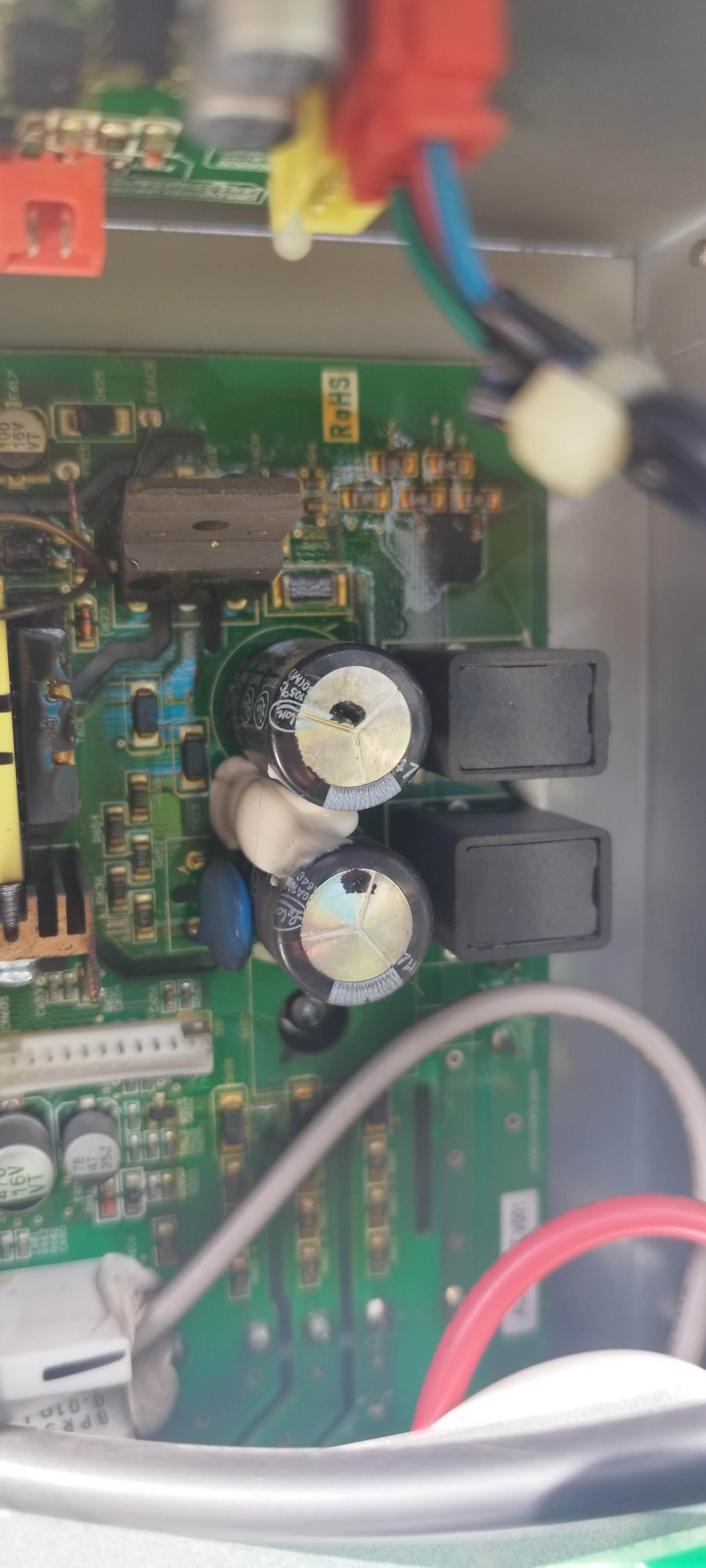 Ten horní kondenzator vypadá že je nepatrně nafouklý. Mohl by to být zdroj problému?