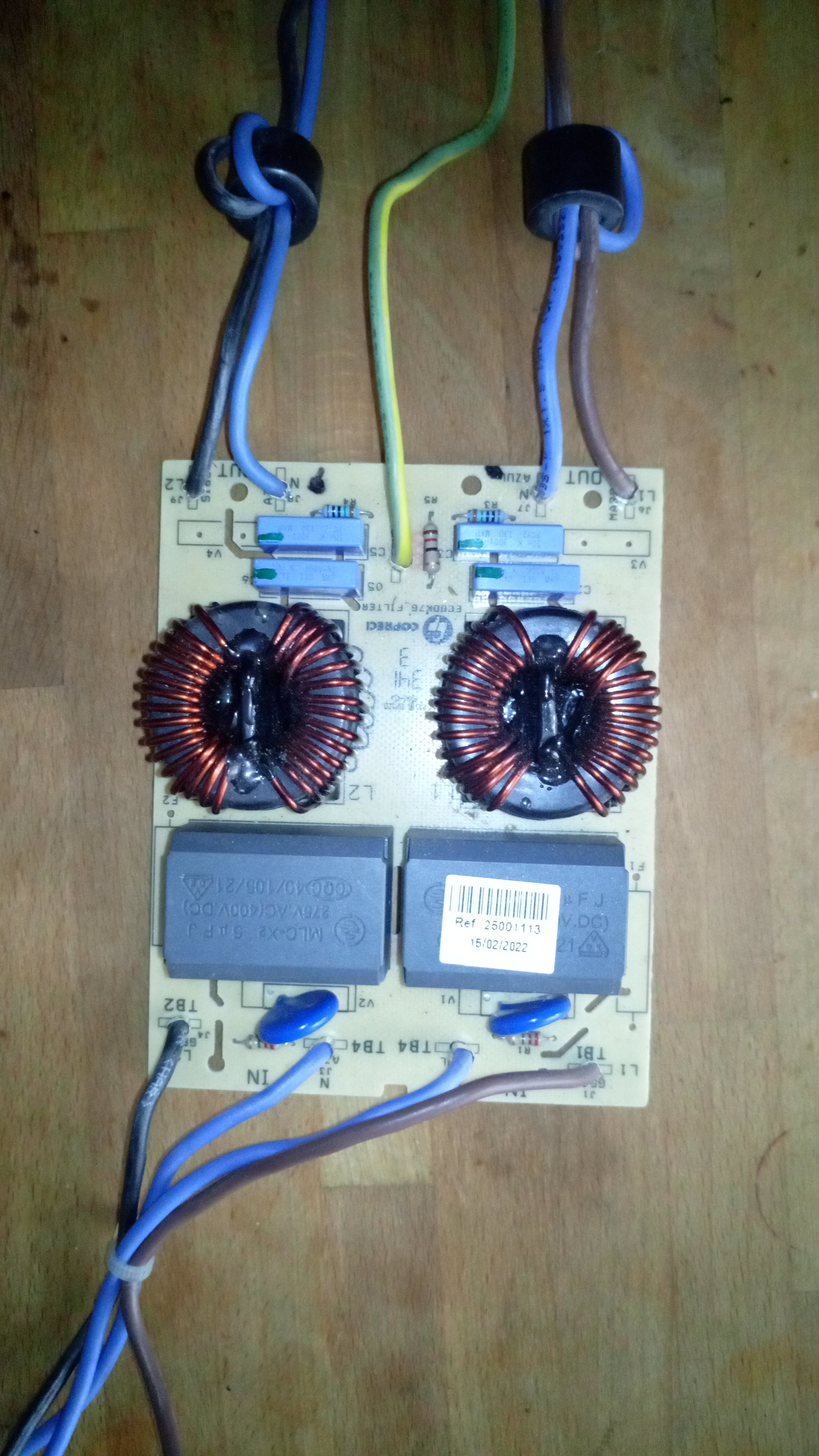 Pro 10kW elektrárnu by měl být externí filtr třeba z velkého fr měniče nebo mám hned po ruce takový malý ze čtyřplotýnkové indukční desky cca 7kW.