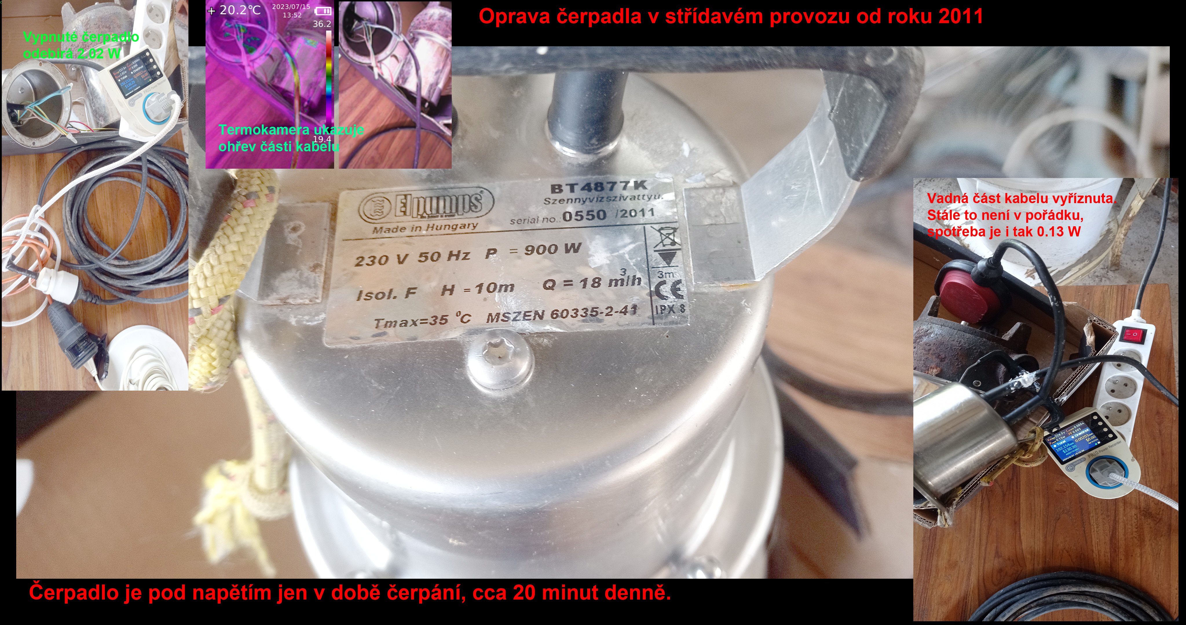 Čerpadlo je stále umístěno v septiku. Vždy, když je venku, je příležitost ho zkontrolovat. To z roku 2011 opět ukazuje unikající proud v kabelu mezi vodiči vedoucí k odběru cca 2W. Termokamera zobrazí ve kterém místě to je. Místo jsem vyřízl a čerpadlo čeká až na něj přijde řada. Buď budu muset přívodní kabely měnit za nové, nebo zjistit, jestli se takový kabel nedá nějak naimpregnovat aby byl dlouhodobě vodoodolný. Rotují takto 3 stejná čerpadla.