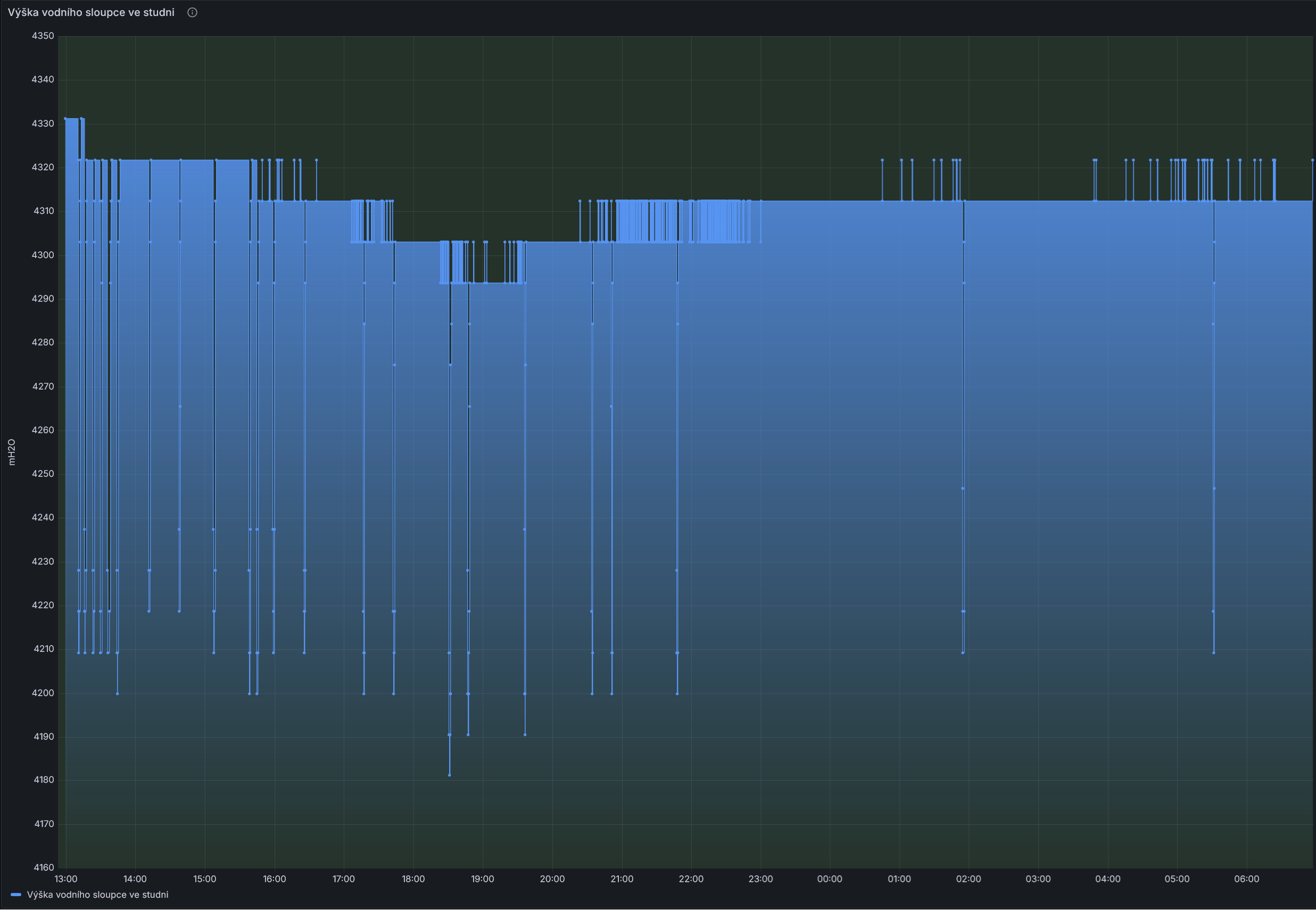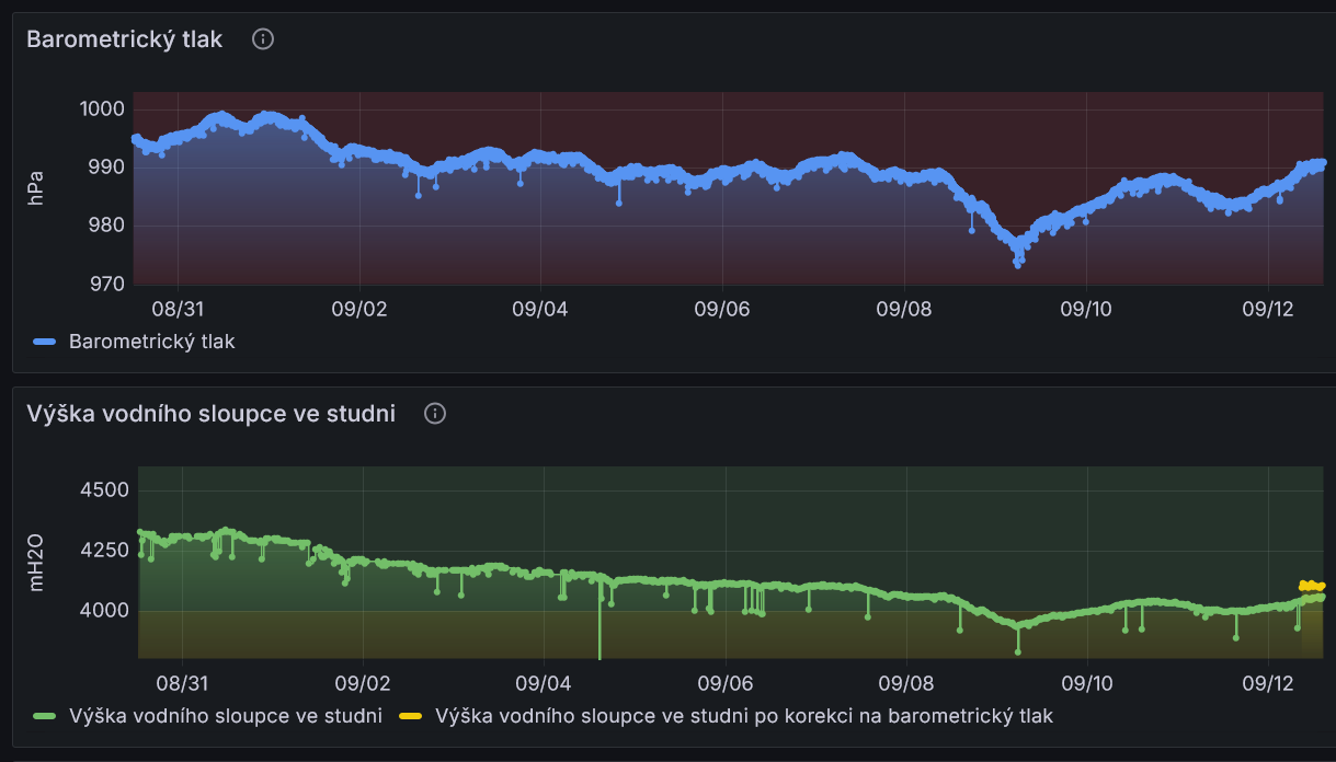 U vrtané studny 40 m je nepravděpodobné, aby hladina nějak moc kolísala. Měřím to ponořeným tlakovým převodníkem 4-20 mA. Ten měří absolutní tlak a je tedy ovlivněn i barometrickým tlakem. Když barometrický tlak stoupá, ukazuje takový ponořený tlakoměr stoupající hodnotu tlaku. Proto je vhodné provádět korekci naměřené hodnoty na barometrický tlak a takto zkorigovaná výška hladiny by neměla tolik kolísat: